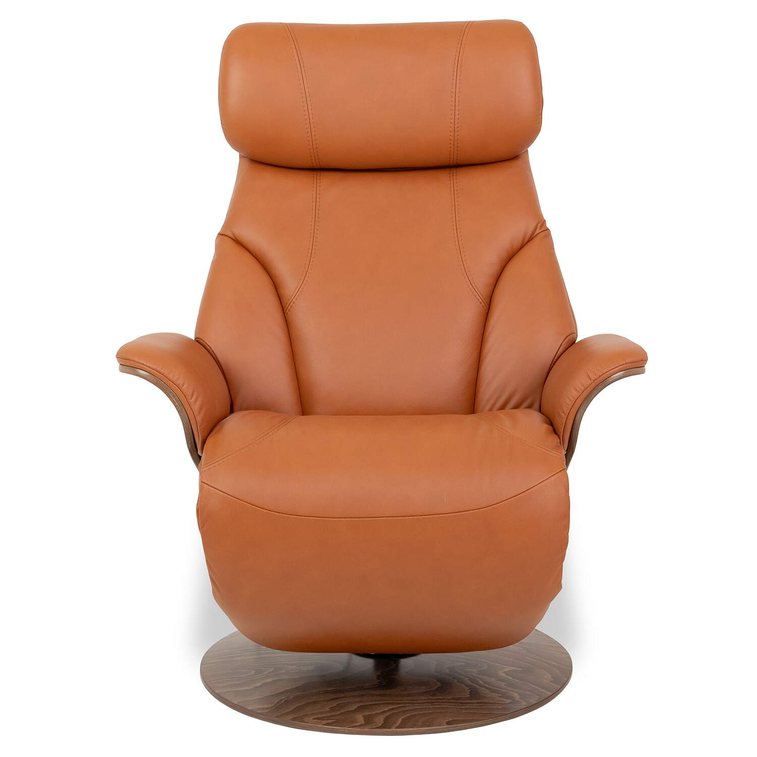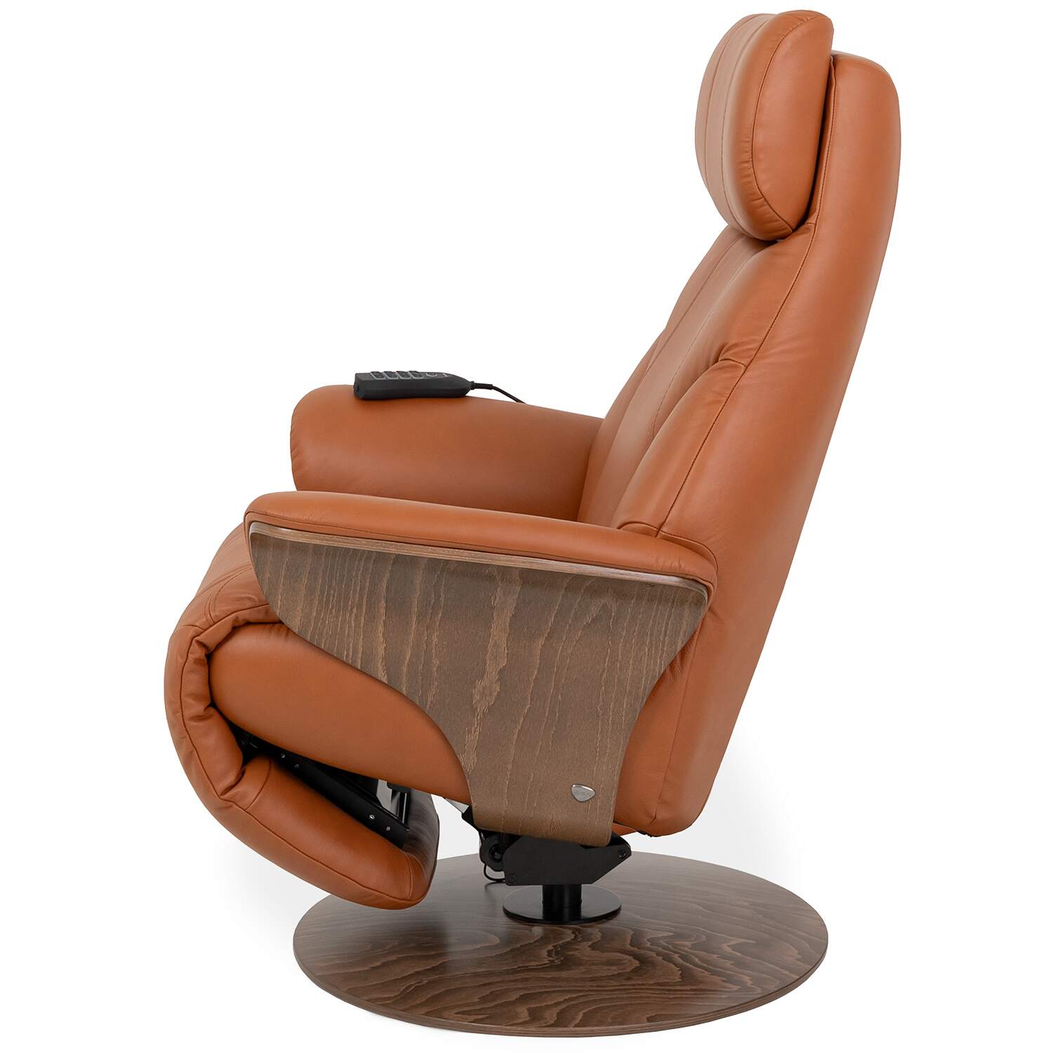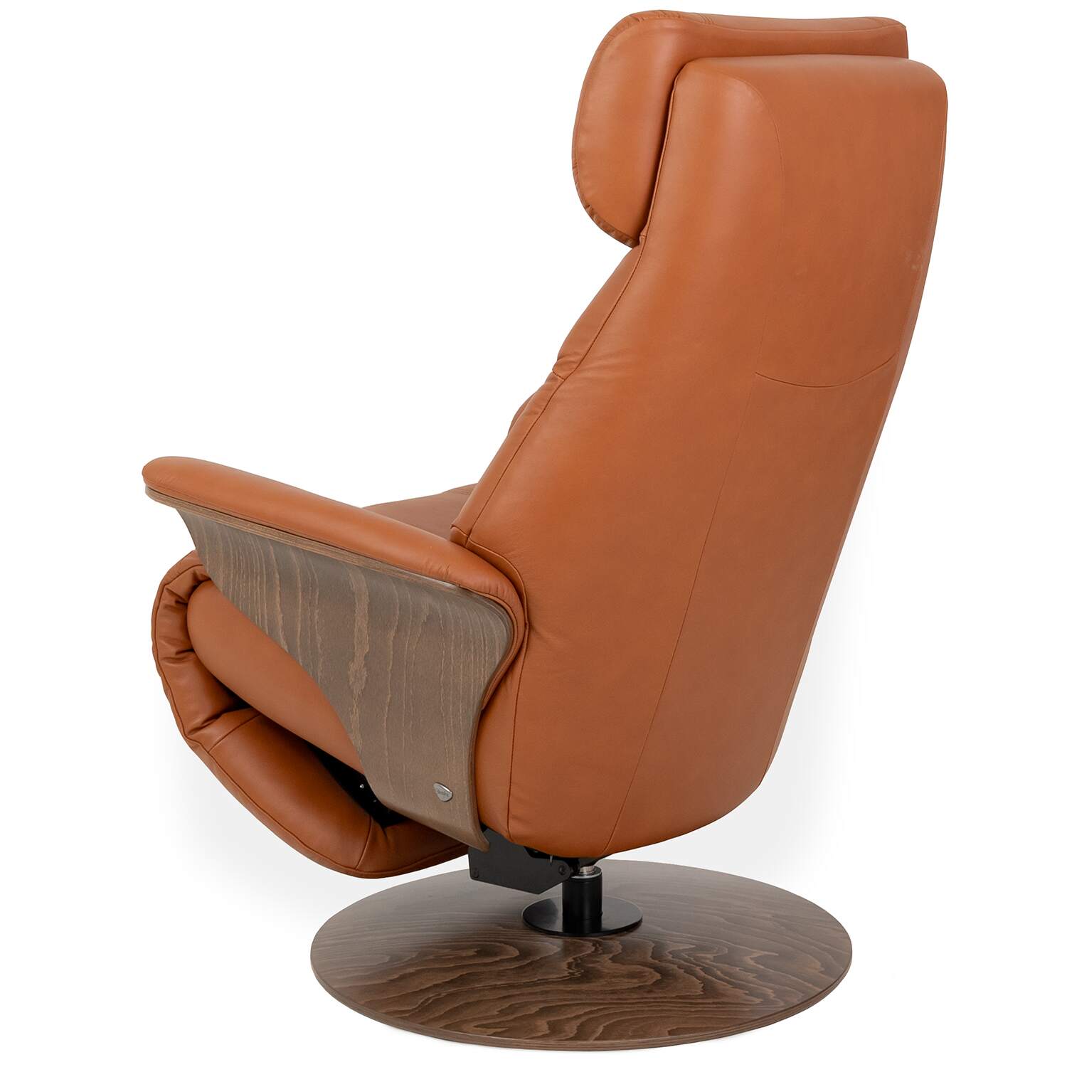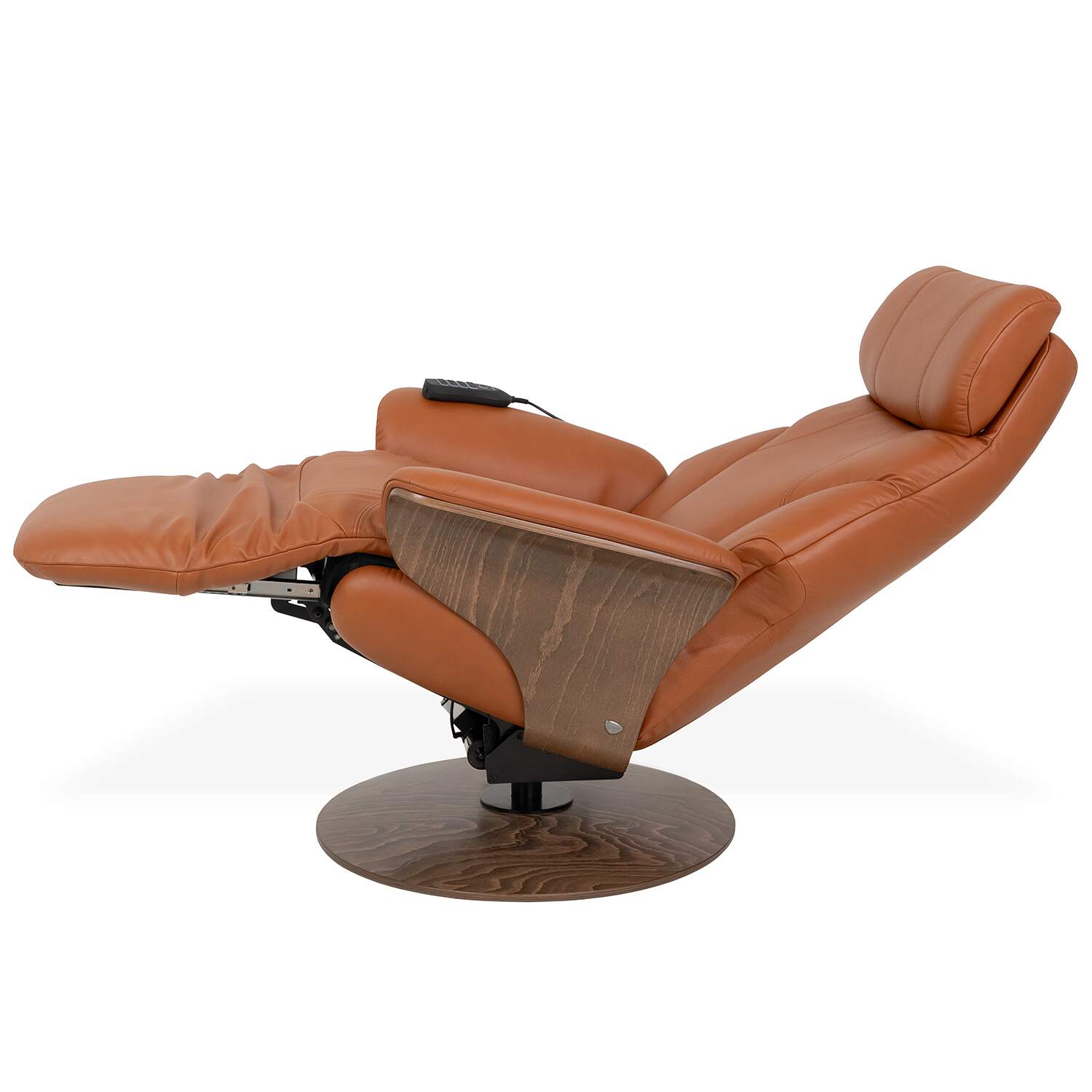 Adam is also designed with ergonomic ComfortZones™ and Plus™ systems that offer enhanced cushioning and body support at all angles. A manually adjustable headrest and 360-degree swivel base provide additional customization and mobility. Upholstered in cognac Paloma leather, Adam features a base and side panels in walnut veneer, and rounded, sinuous lines for soft elegance.