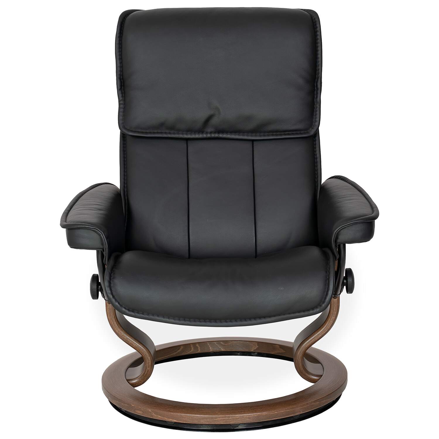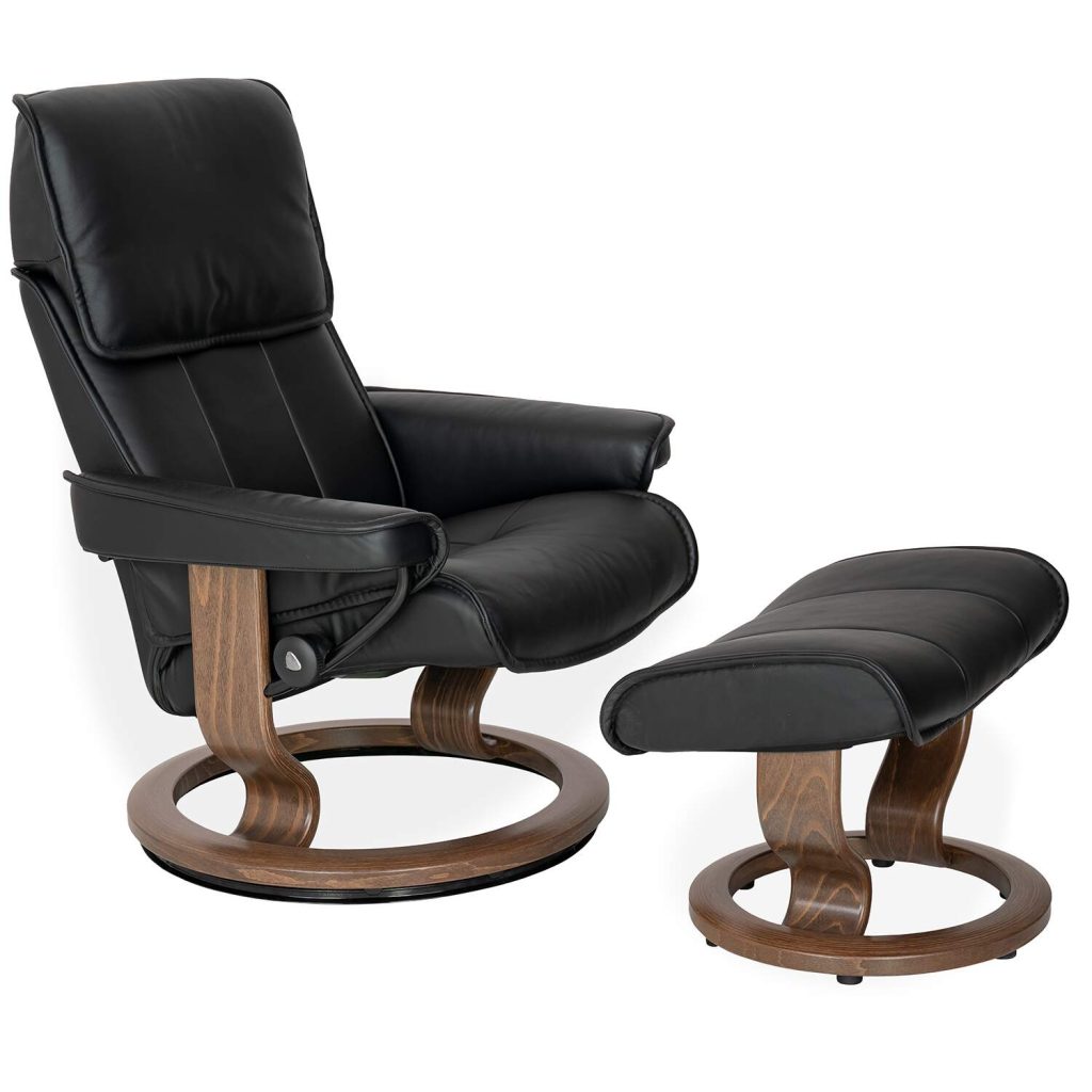 The Admiral Medium Chair and Ottoman, designed by Ekornes of Norway, has a classic design with cutting edge comfort technology. Available with a classic teak base and black Paloma leather upholstery, this piece provides full-body support, with an ample pillow-like headrest, and matching stiching. Admiral is equipped with Stressless® Plus™ and Glide systems, which allow the chair to provide continuous support for the head and lower back, while also adjusting the reclining angle based on shifts of the body.