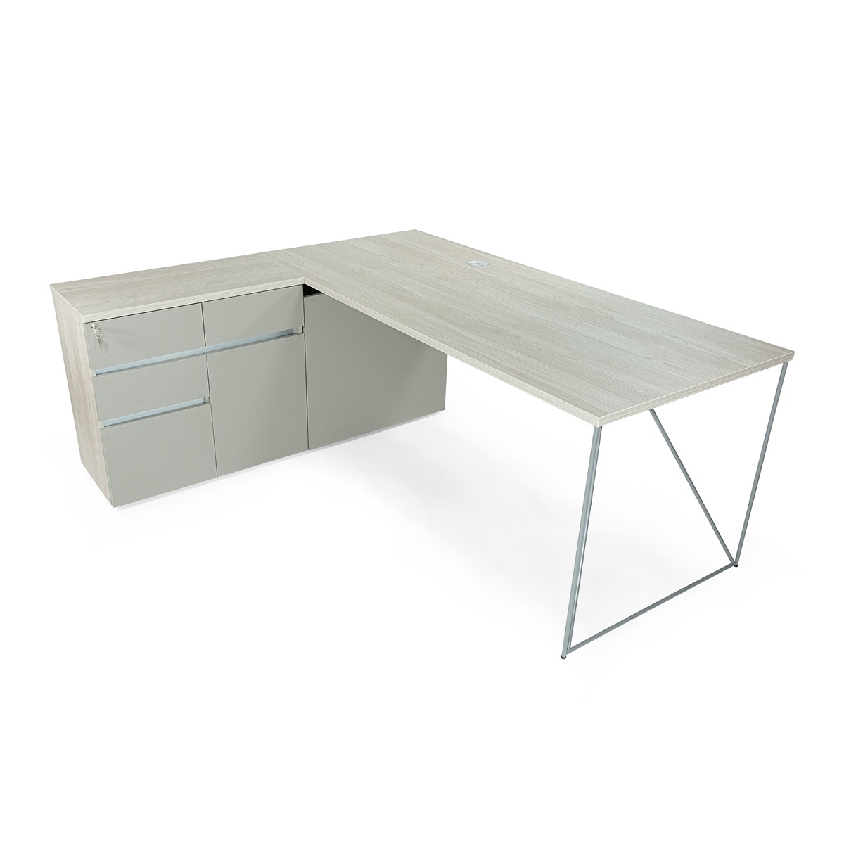 [0] => air desk with cabinet to left when seated. desk top and cabinet case in grey wood laminate d5. drawer fronts cubnait grey n2. ncss6500 grey metal parts. cable port cover in metallic (m) 70.8x62.9x29h