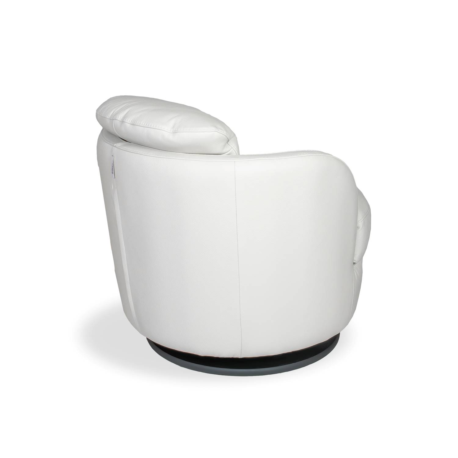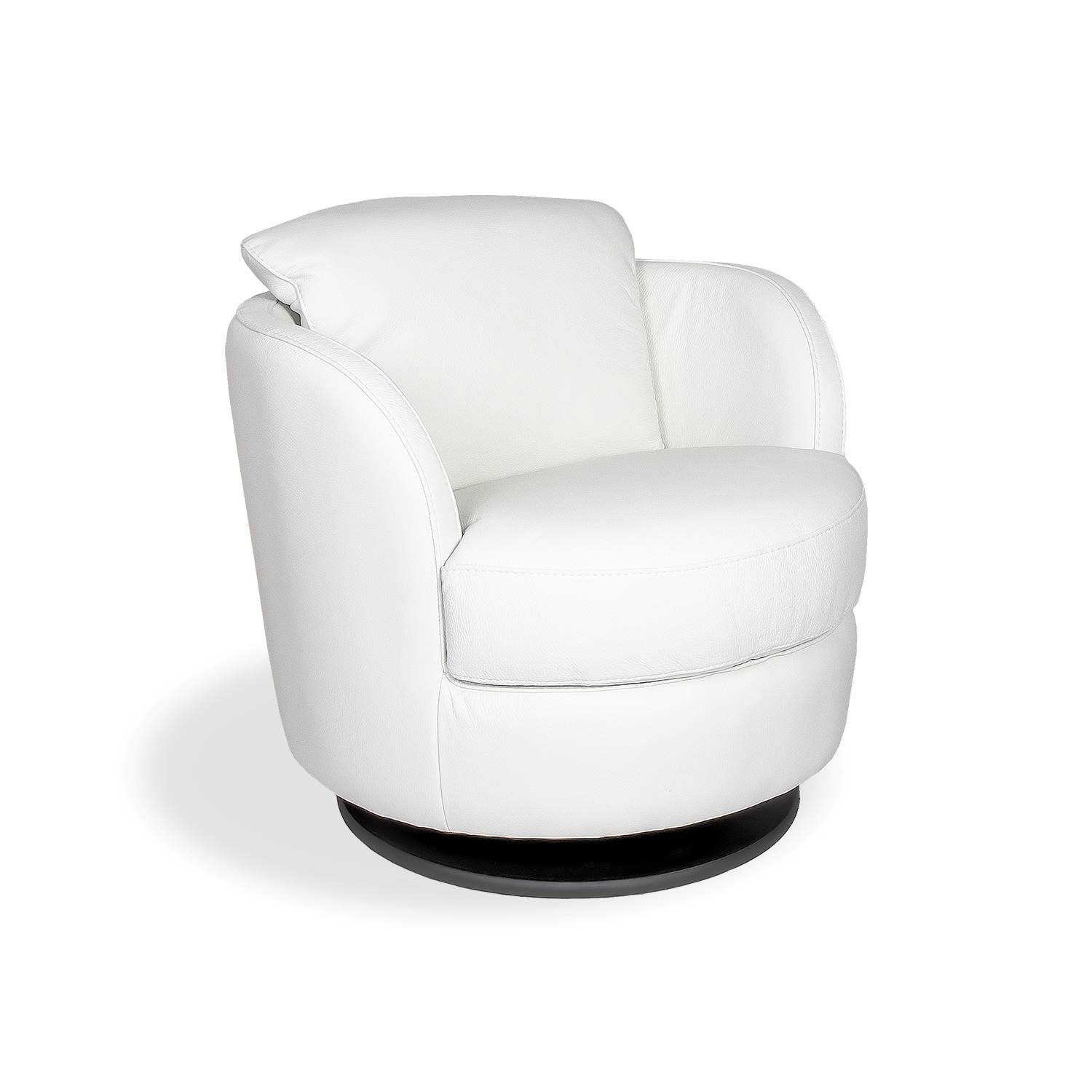 The Aldo Swivel Chair is made in Italy and features white Giotto leather upholstery. Aldo is compact yet comfortable and swivels as well as rocks, letting you choose your favorite seating position. With a black base and matching stitching, this chair is versatile, eye-catching, and ready to spruce up any living space.