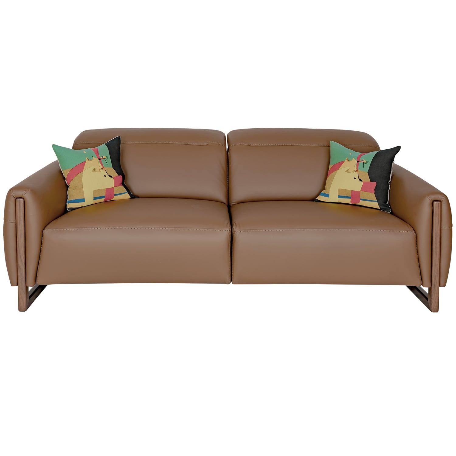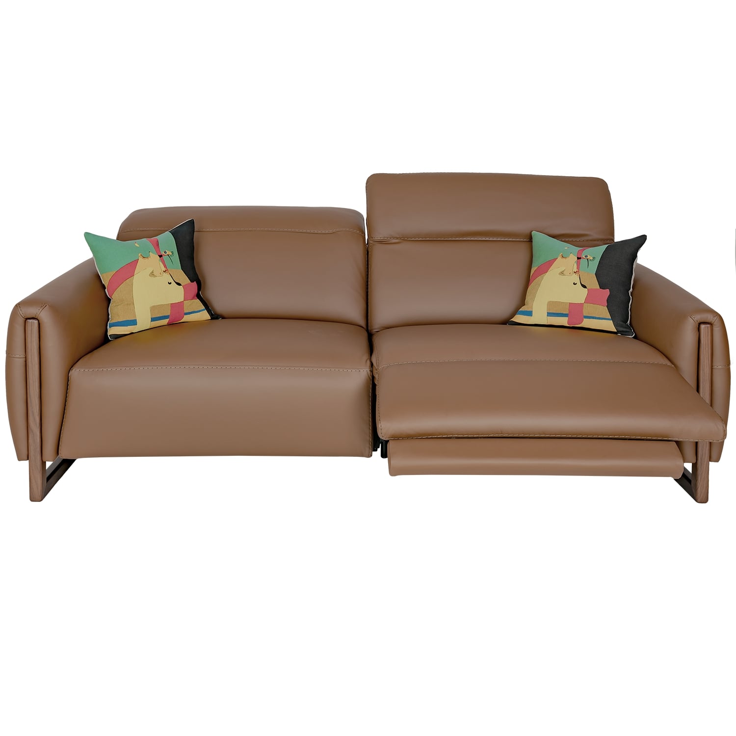 Made in Italy, the Alessia Power Sofa unites retro-inspired style with customizable comfort at the touch of a button. Alessia features leather upholstery in warm clay brown, accentuated by matching stitching and walnut legs. The wood of the base continues up the front of the armrests to create a unique look with a sense of lightness and suspension. With two power motion seats, a USB charging port, and cushions that have a bouncy, supportive feel, Alessia will introduce a new level of relaxation to your living space.