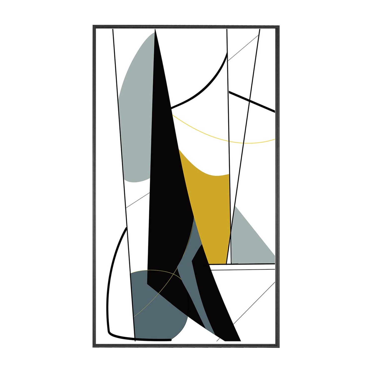 The Alima Wall Art is a geometric abstract piece on canvas with a black frame. Stark, angular shapes are outlined in black on a white background, with subtle blues and yellow adding a touch of color. Minimalist and sophisticated, the Alima Wall Art will enhance any contemporary or modern environment.