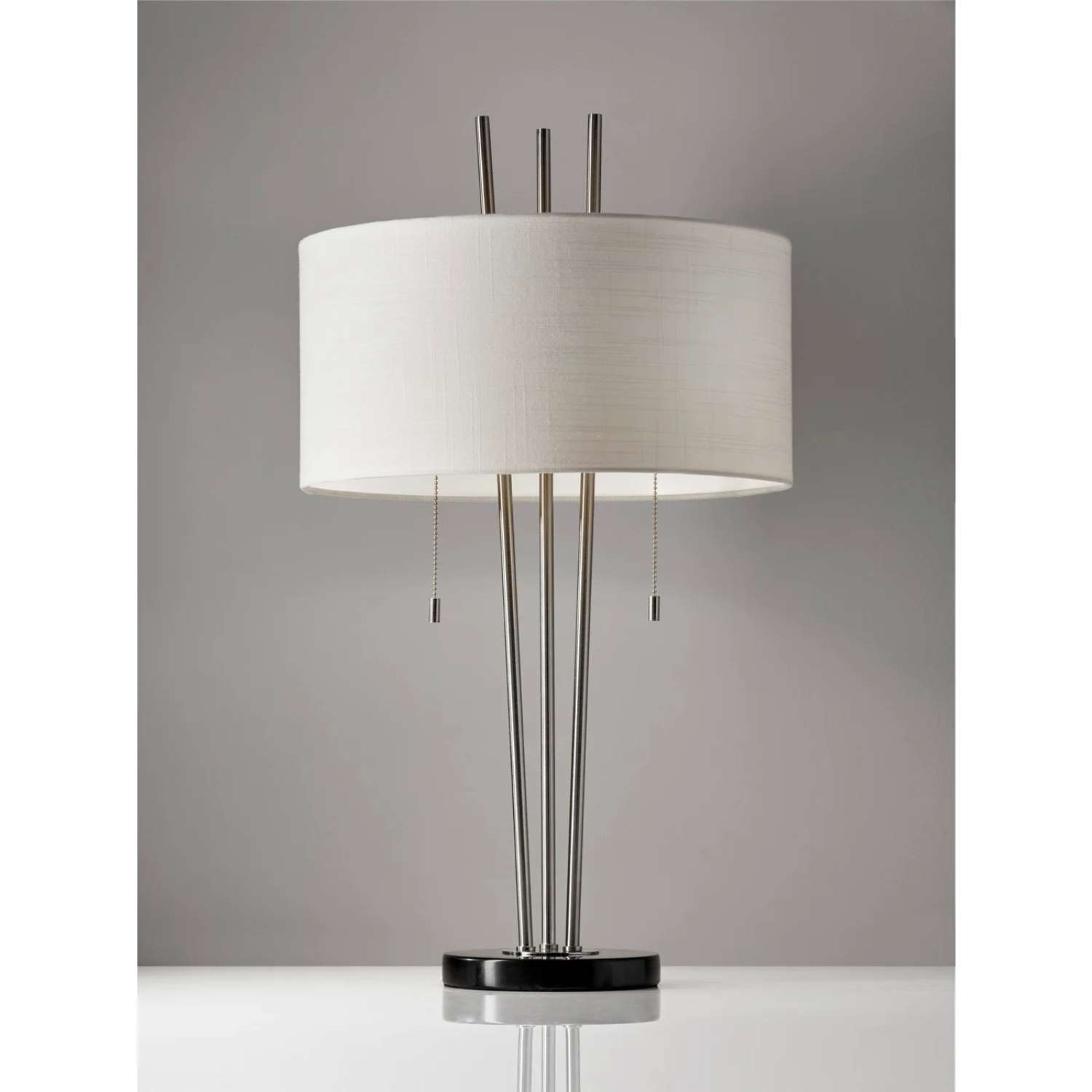 The Allison Table Lamp features a textured white linen shade, three brushed steel poles, and a black marble base. The steel poles angle outward towards the ceiling as they extend from the shade, creating a unique, elegant silhouette, while double pull chain switches allow you to turn the lights on and off independently. Allison has dual bulb illumination and a 60" clear cord.