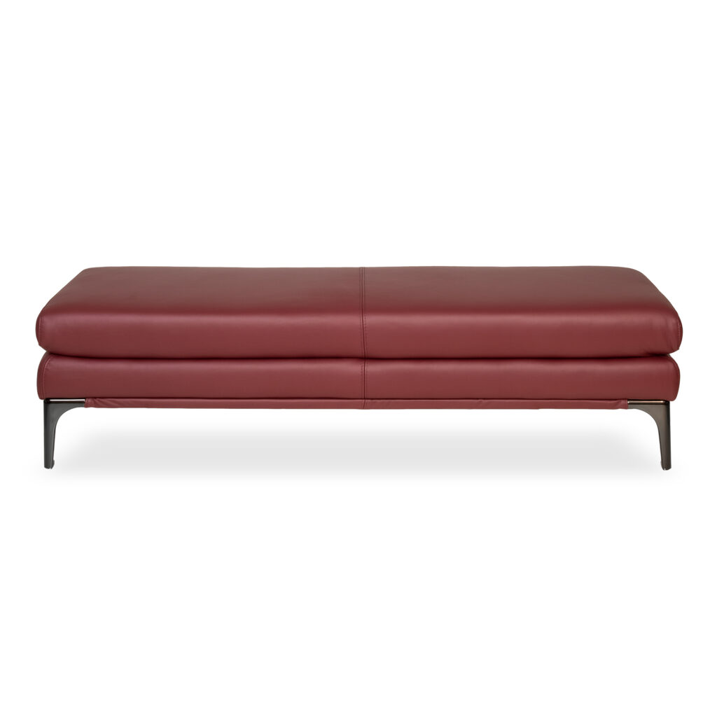 The Allure Bench features an elegant, elongated form perfect for accommodating multiple sitters. Upholstered in bright ruby protected leather, this bench has accent stitching down its middle, shiny grey metal legs, and a pleasing layered look. Allure will add a dash of bold color to any entryway, living room or office waiting area.