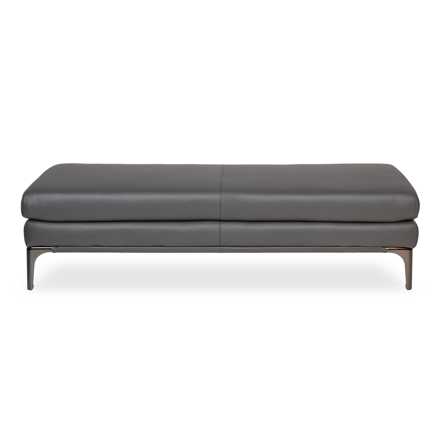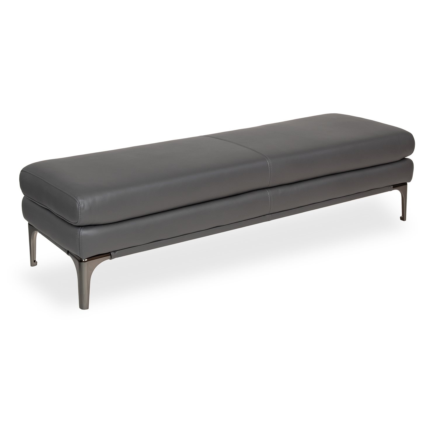 The Allure Bench features an elegant, elongated form perfect for accommodating multiple sitters. Upholstered in protected leather with a versatile shale grey color, this bench has accent stitching down its middle, shiny grey metal legs, and a pleasing layered look. Allure makes a great addition to an office waiting area, entryway, or living room in need of extra seating.