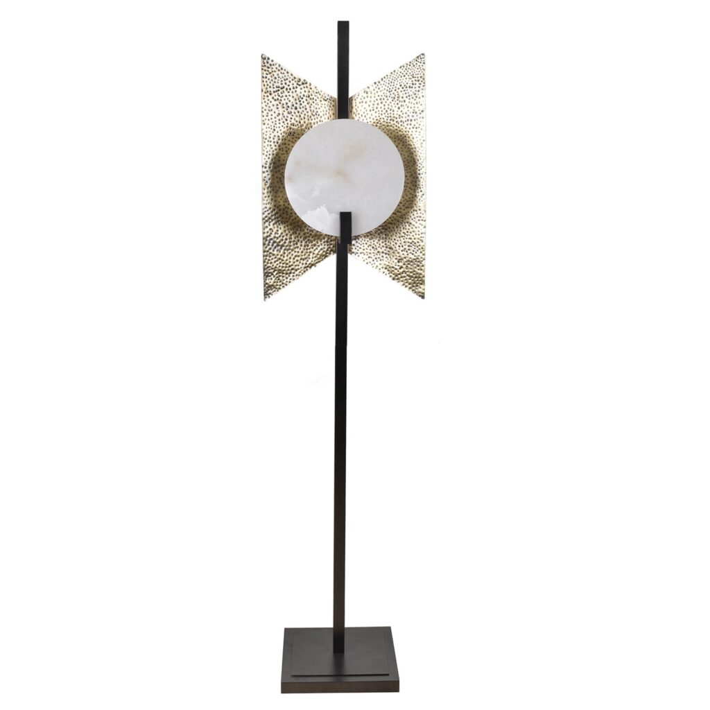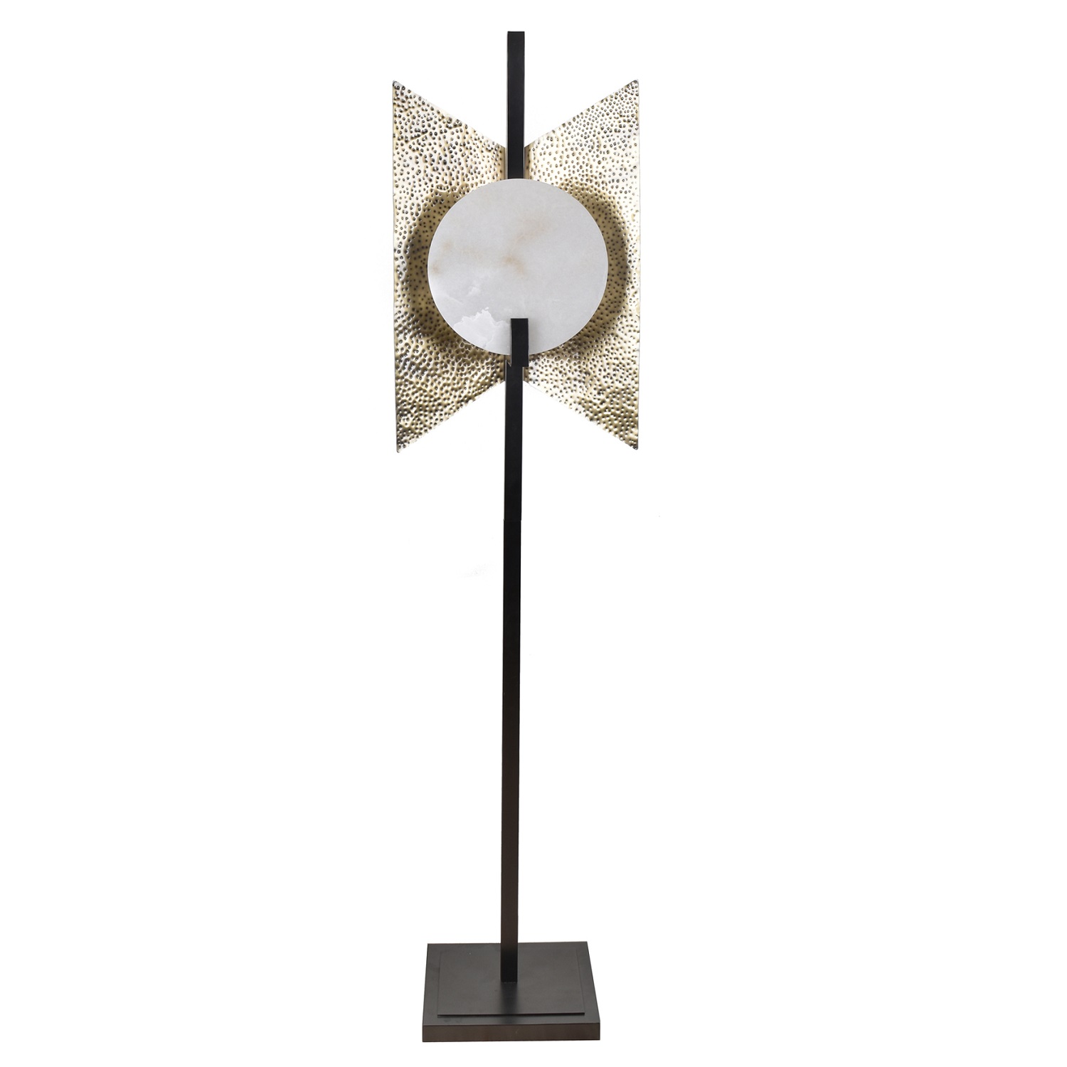 The Amory Floor Lamp features metal and alabaster hammered brass with an alabastar finish. A true mixed media piece, this lamp is a work of functional sculpture that brings bold, artistic character to your living or office space.