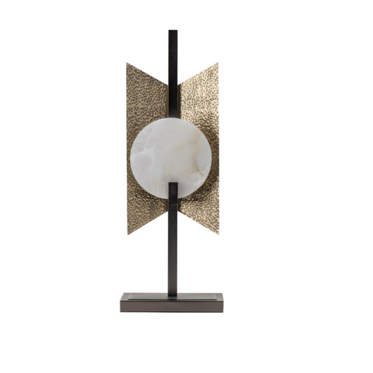 The Amory Table Lamp features metal and alabaster hammered brass with an alabastar finish. A true mixed media piece, this lamp is a work of functional sculpture that brings bold, artistic character to your living or office space.