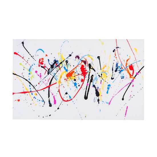 The Amplified Wall Art is a fun, colorful piece that features streaks of orange, yellow, blue, purple, and black against a solid white background. Amplified's bright tones add spontaneity and a splash of color to your home or office space. This painting has a gloss finish and bleeding borders.