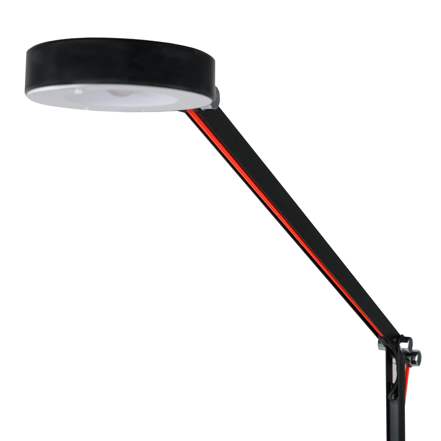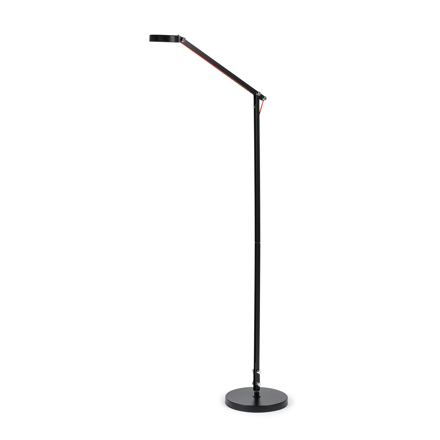 [0] => The Amsterdam Floor lamp features LED lighting and is available in all black with attractive red accents in a rope-like material. Simple straight lines connect a circular light to a circular base, creating an elegant contrast. This lamp is easily adjustable and moves at the touch of your hand.