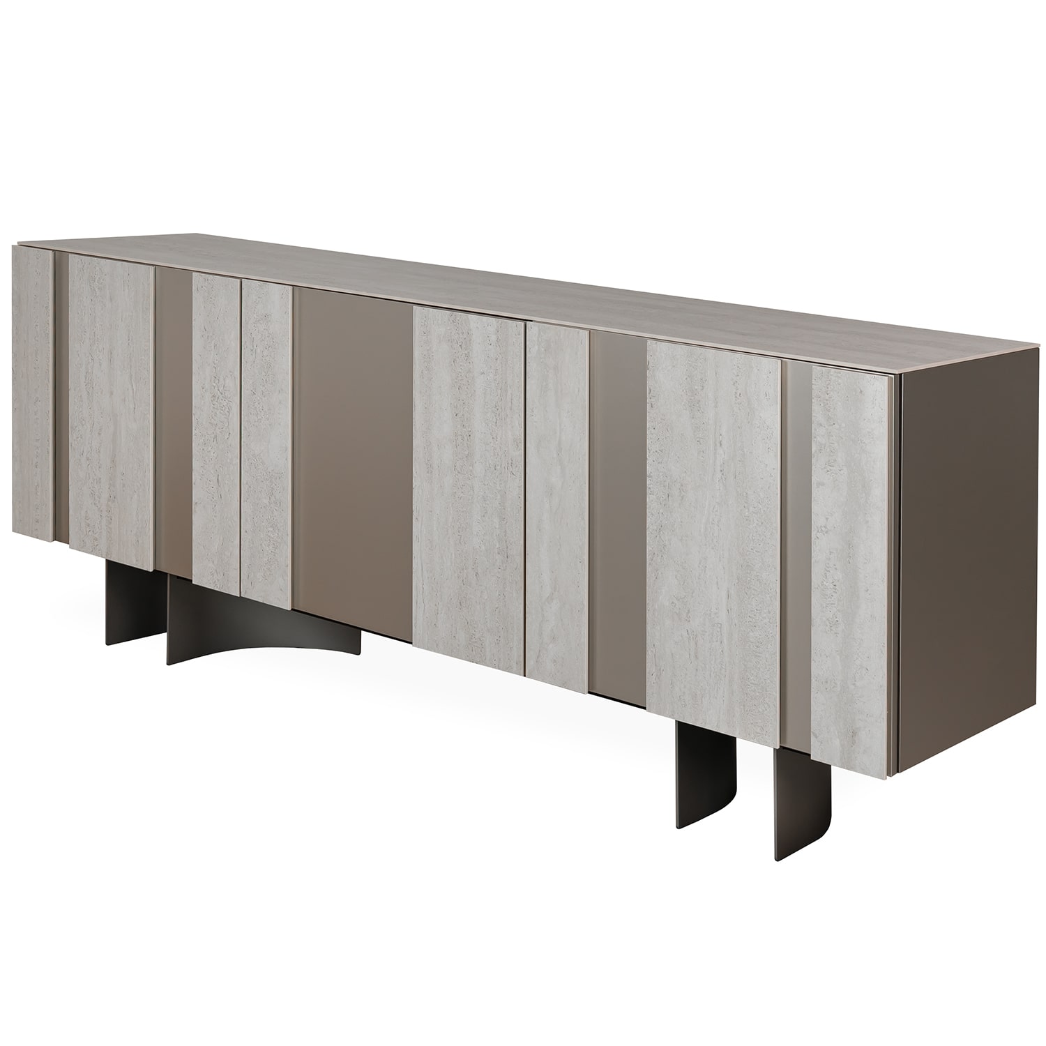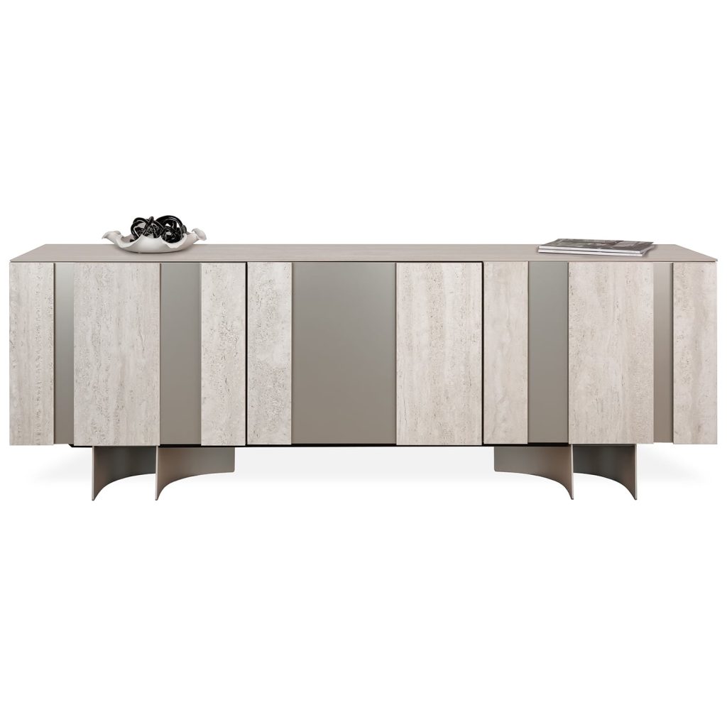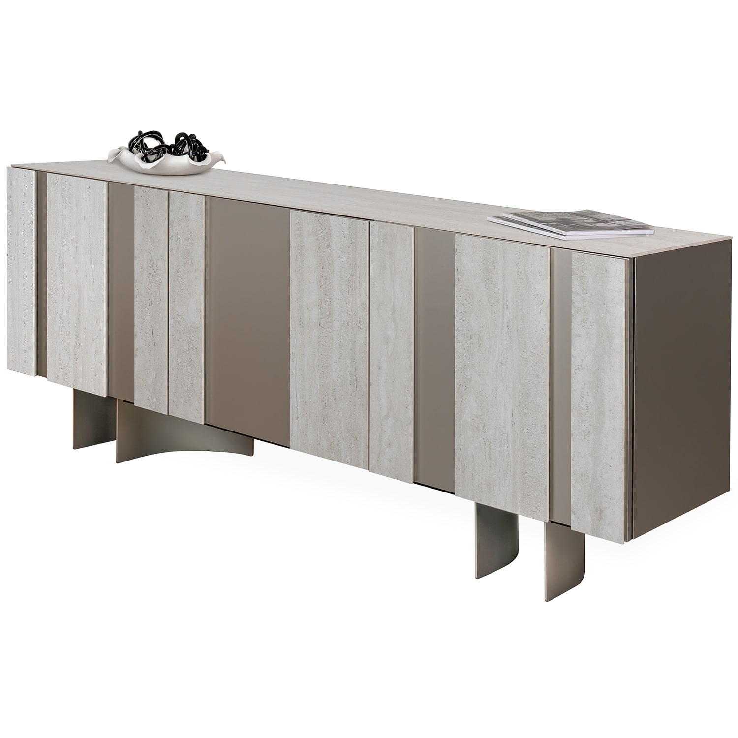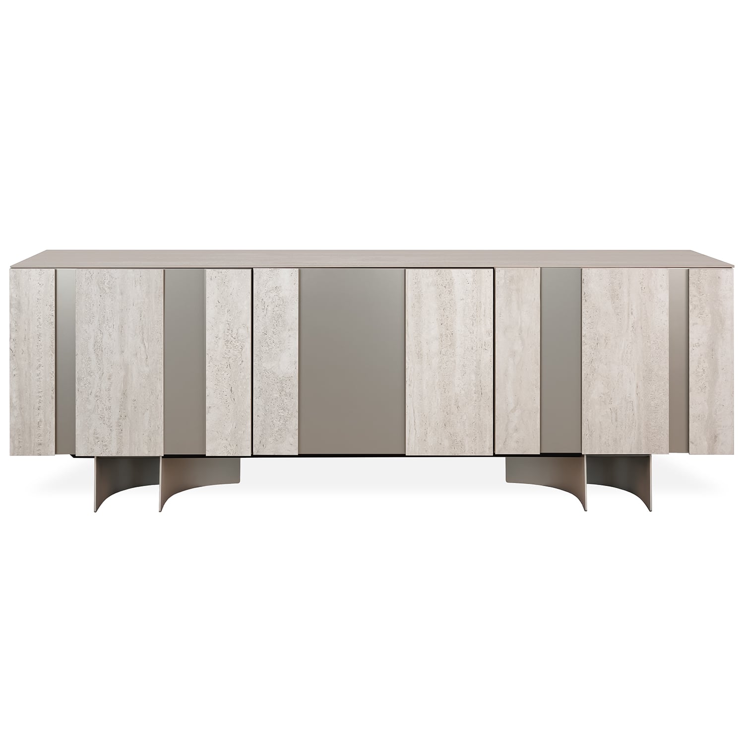 Refined and elegant, the Amsterdam Sideboard combines a structure made of titanium lacquered wood with a top and door inserts in beige Colosseo ceramic marble. The alternating finishes on the doors create a pattern like piano keys, supported by parallel curving feet of steel. Both beautiful and functional, this Italian-made sideboard has three cabinets with soft-close doors, adjustable glass shelving, and an optional interior drawer.