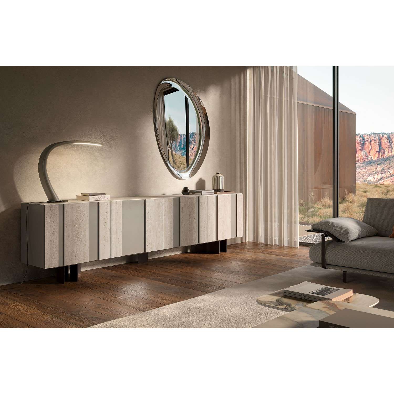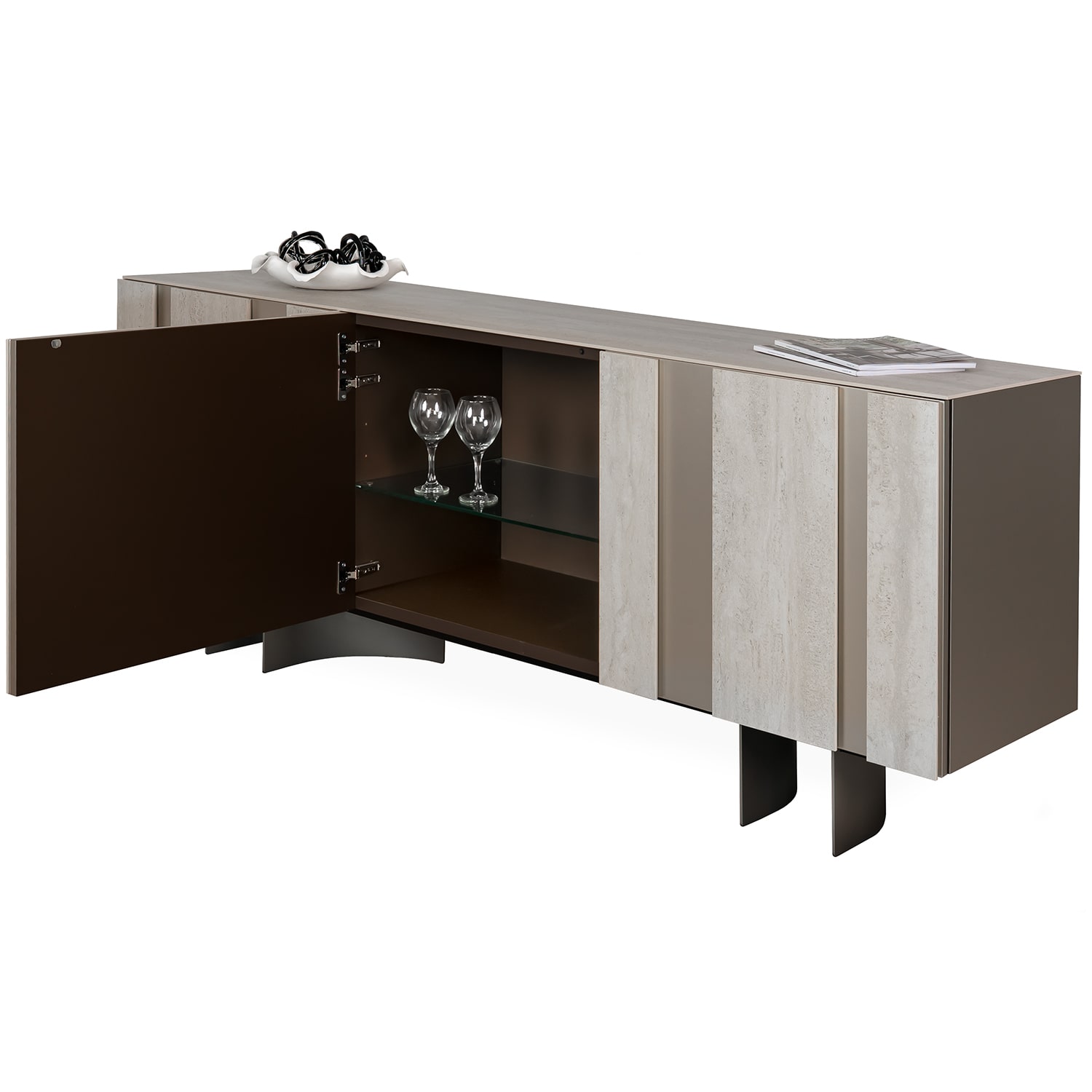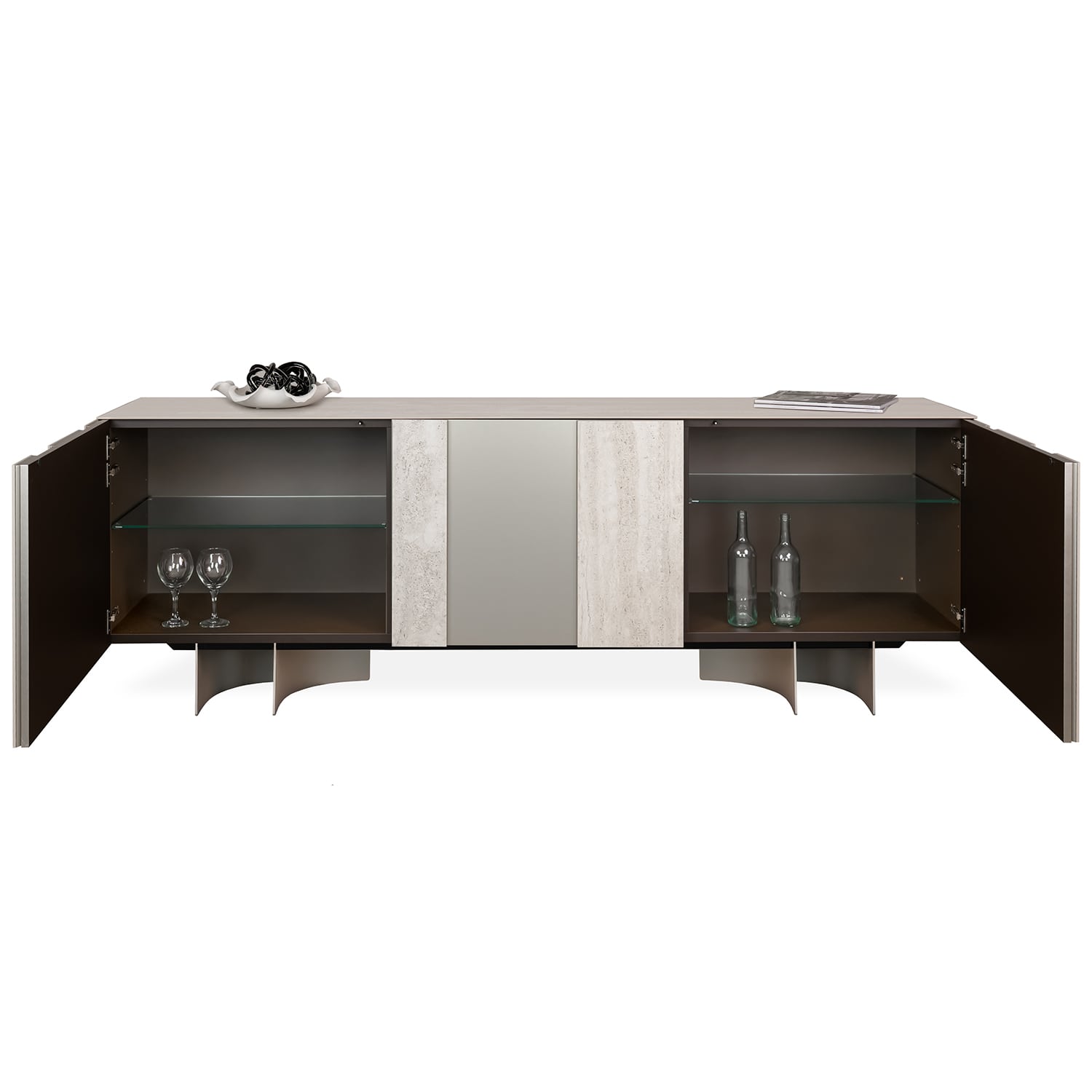 Refined and elegant, the Amsterdam Sideboard combines a structure made of titanium lacquered wood with a top and door inserts in beige Colosseo ceramic marble. The alternating finishes on the doors create a pattern like piano keys, supported by parallel curving feet of steel. Both beautiful and functional, this Italian-made sideboard has three cabinets with soft-close doors, adjustable glass shelving, and an optional interior drawer.