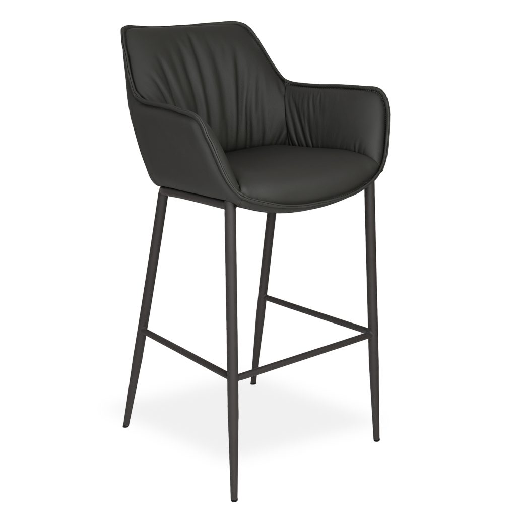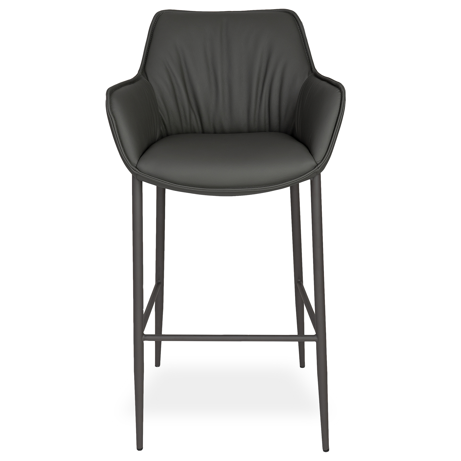 The Anita Barstool features a rounded shell design that curves in to form cradled arms and a gently-sloped seat. Upholstered in soft grey leather, Anita features accent stitching on the seat, back, and arms that adds a tailored finish, as well as a metal base formed by four cappuccino brown angled legs. Subtly playful and effortlessly comfortable, Anita will add instant style to your bar setup.
