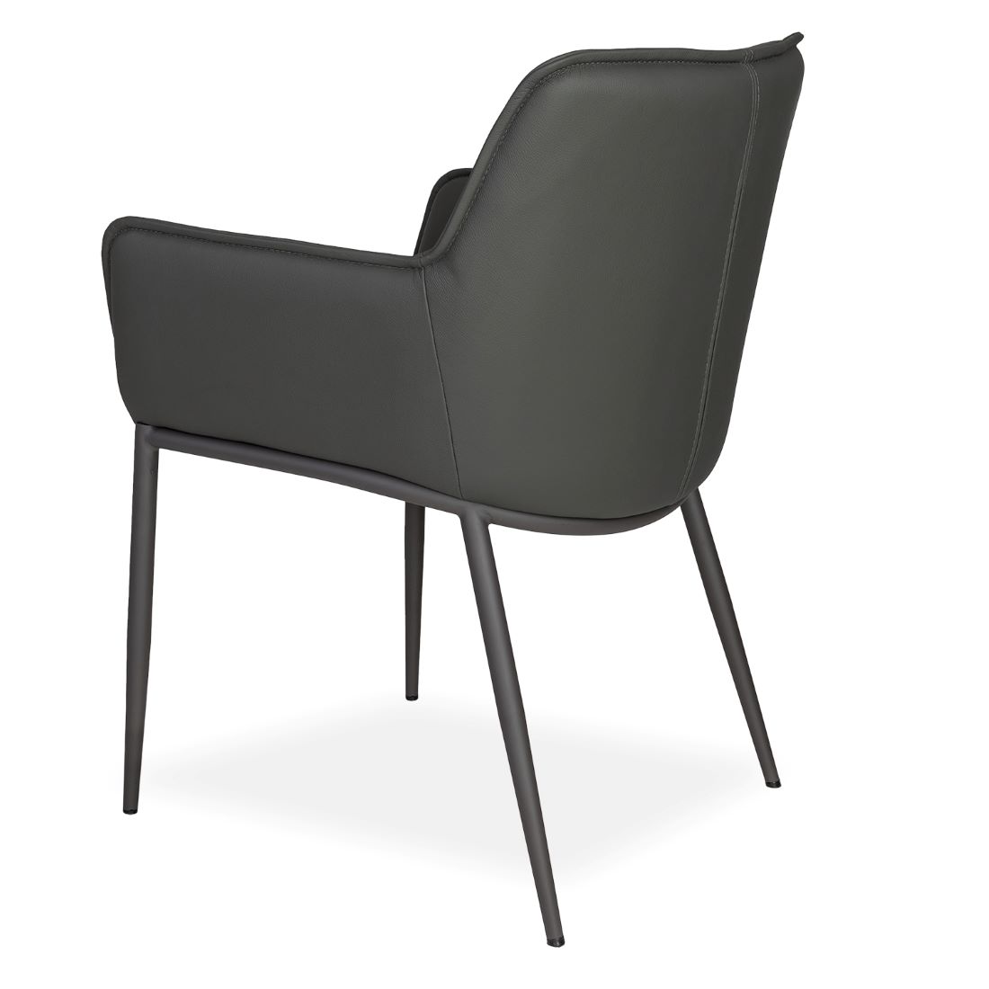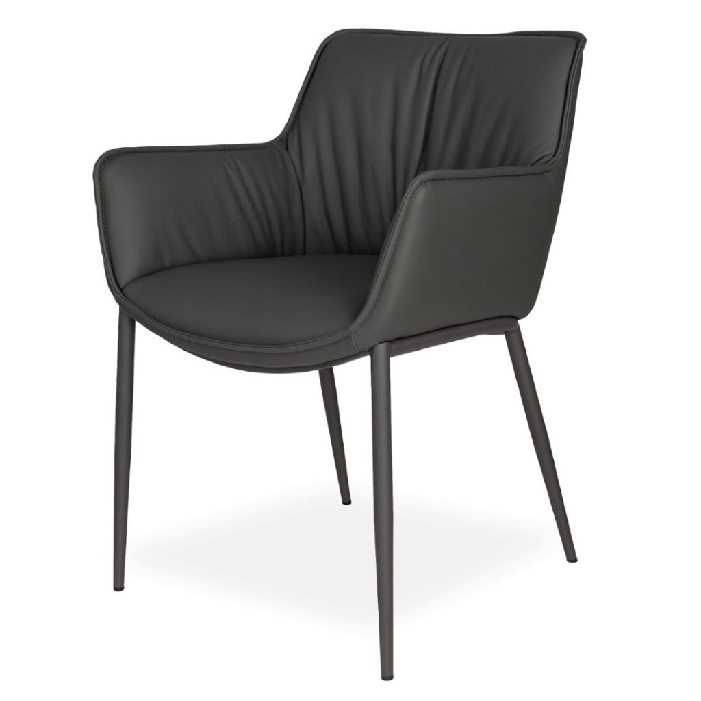 The Anita Dining Chair features a rounded shell design that curves in to form cradled arms and a gently-sloped seat. Upholstered in soft grey leather, Anita features accent stitching on the seat, back, and arms that adds a tailored finish, as well as a metal base formed by four cappuccino brown angled legs. Subtly playful and effortlessly comfortable, Anita will add instant style to your dining space.