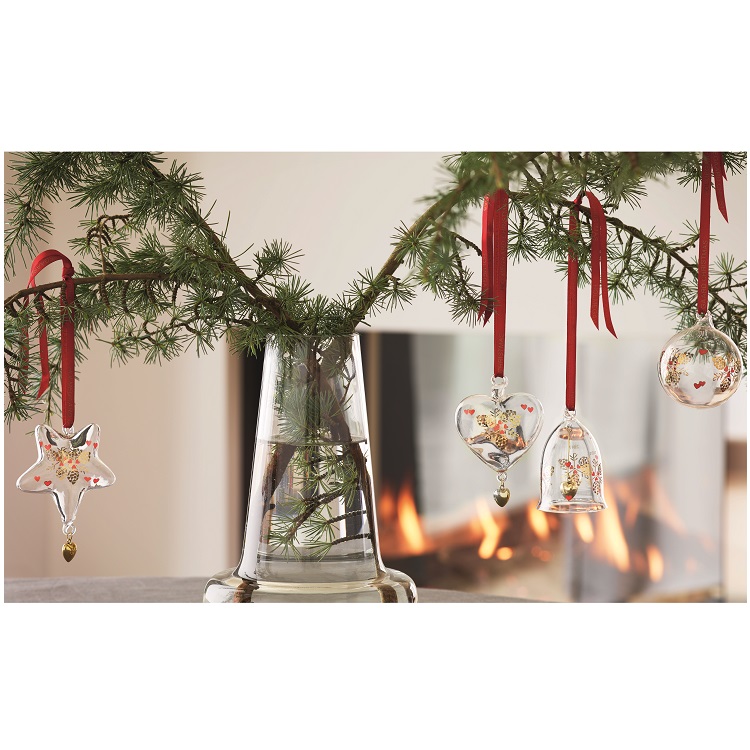 [0] => The Annual Christmas Bell ornament, designed for Holmegaard by Anne-Sofi Romme, is an elegant and beautiful hand-blown Christmas ornament inspired by this year's Christmas motif - the cone- and decorated with bright gold and red. The Christmas Bell comes with a special red ribbon that you can use to hang the bell on your tree, in a window, or from a decorative branch.