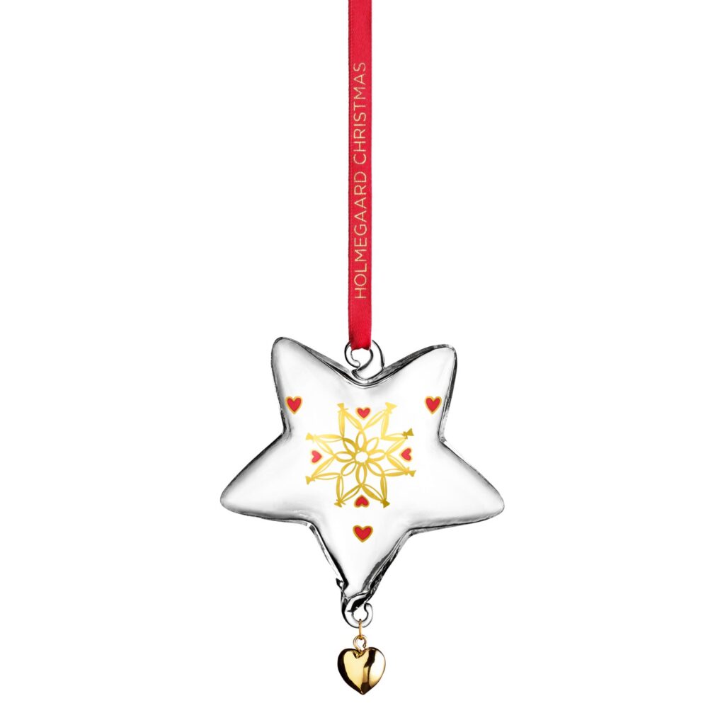 [0] => The Annual Christmas Star ornament, designed for Holmegaard by Anne-Sofi Romme, is an elegant and beautiful mouth-blown Christmas ornament inspired by the 2021 Christmas motif - the snowflake - and decorated with bright gold and red hearts. The Christmas Star comes with a special red ribbon that you can use to hang the star on your tree, in a window, or from a decorative branch.