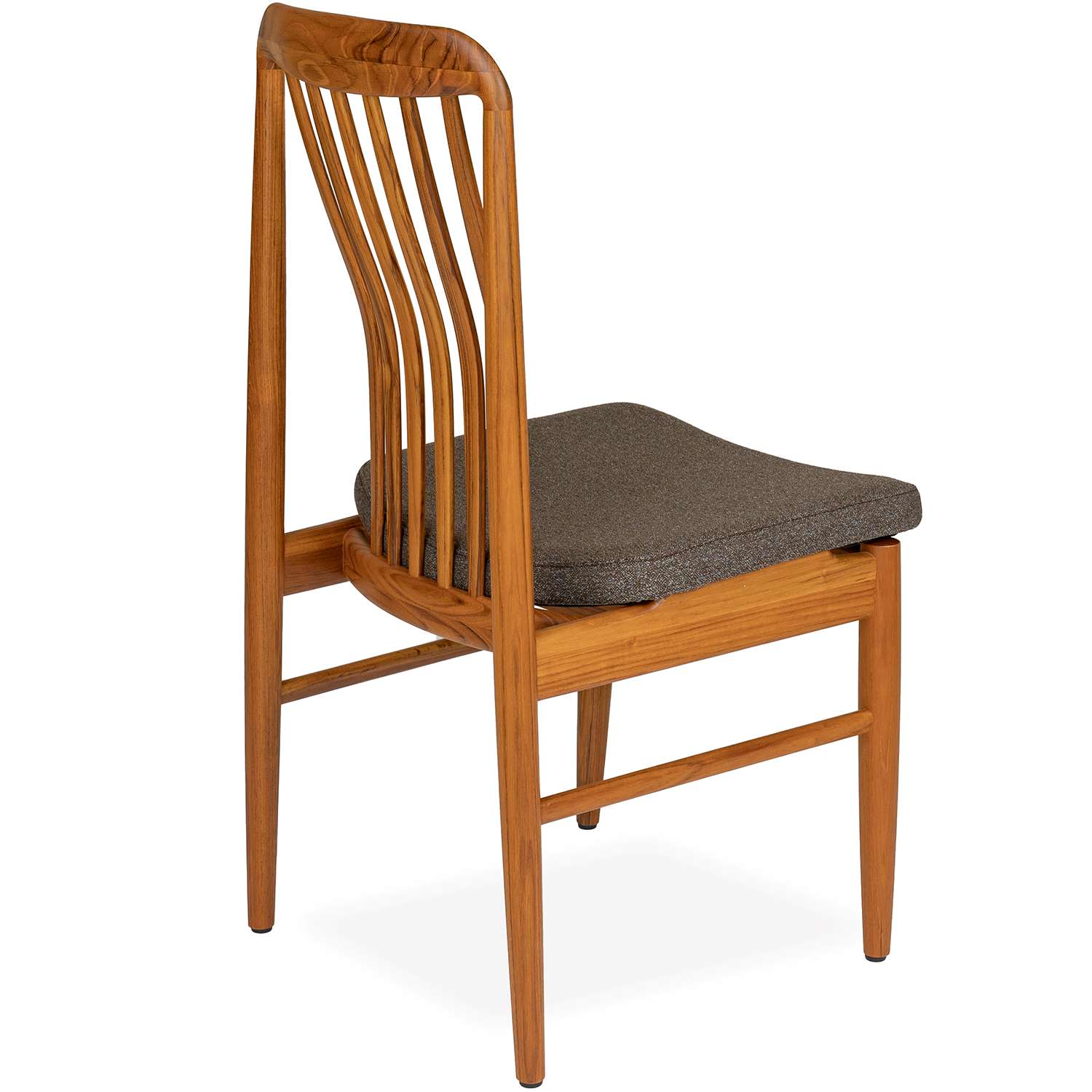 Crafted from teak wood, the Anya Side Chair presents a classic silhouette and lightweight design inspired by Scandinavian furnishings. Anya features clean, gently curving lines and a backrest with six vertical slats that follow the shape of your spine, maintaining your comfort through cozy breakfasts, leisurely lunches, and lively dinners. A seat cushion in brown fabric with tones of grey adds a welcoming touch to this timeless chair.