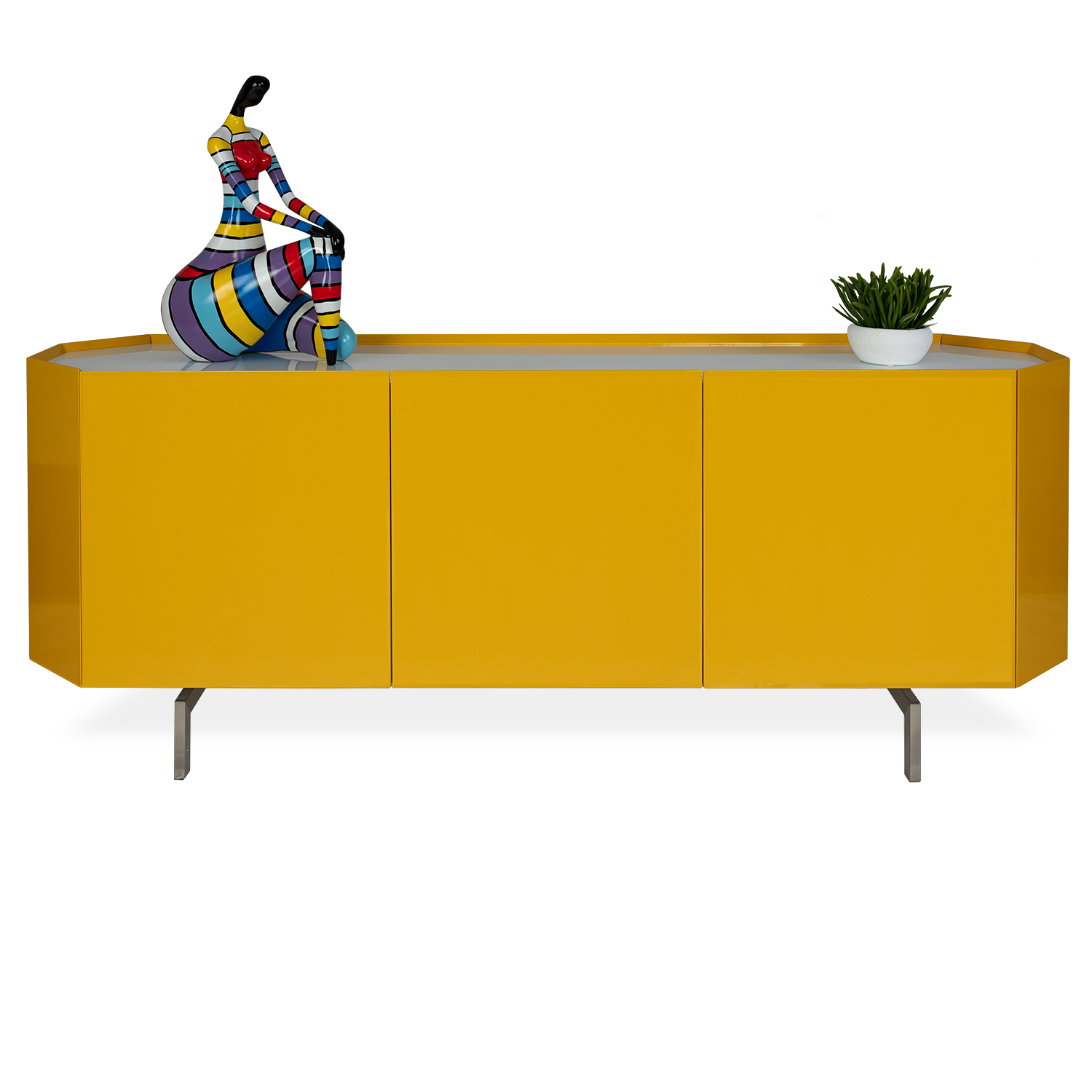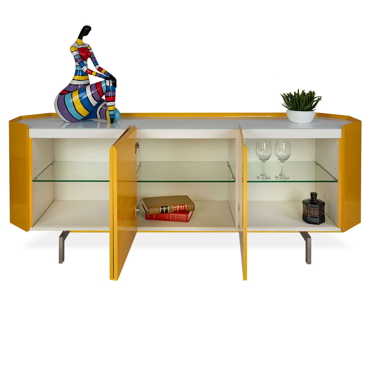 [0] => The Apollo Sideboard embodies a bold mix of style and utility, with its yellow glossy finish and geometric shape featuring angled sides. A white glass tabletop is inset with color-changing LEDs, customizable with an included remote. Supported by slim rectangular legs, Apollo has three doors that reveal inner compartments with glass shelving to store all your dining and entertainment necessities. With its modern design and unique touches, the Apollo Sideboard is the perfect union of functionality and fun.