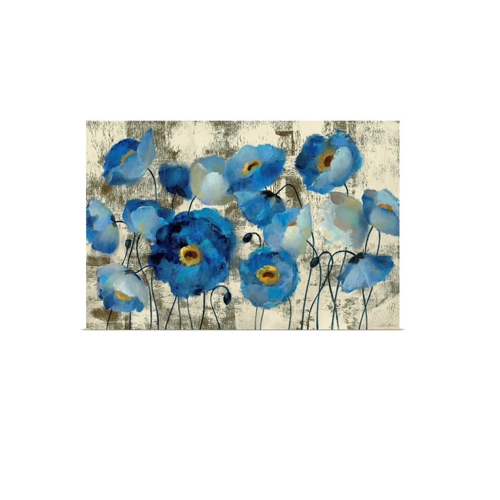 [0] => The Aquamarine Wall Art depicts a collection of overlapping blue flowers that appear to bend in the breeze, set against an off-white background streaked with black. The yellow centers of the flowers bring a vivid pop of color to the muted tones of blue, off-white, and black, which lend the painting a calm, mellow feel. This painting has a gloss finish and bleeding borders.