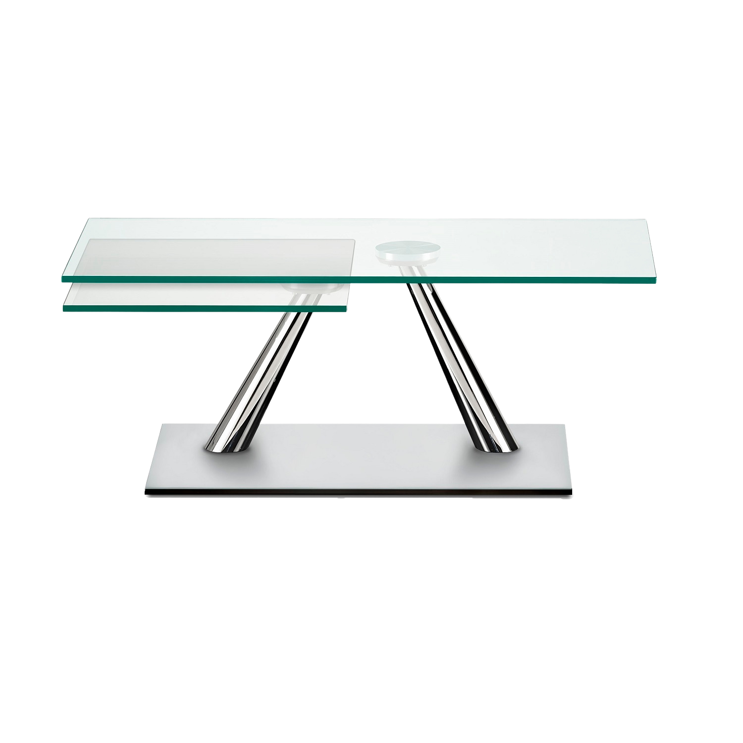 The Aqui Coffee Table, made in Italy, features a satin silver base, chrome supports, and clear glass tops. This piece is sculptural and functional with its synchronized swivel crystal tabletops, which can be arranged to overlap or serve as two separate surfaces. Aqui is sleek and easily adaptable to your living needs.