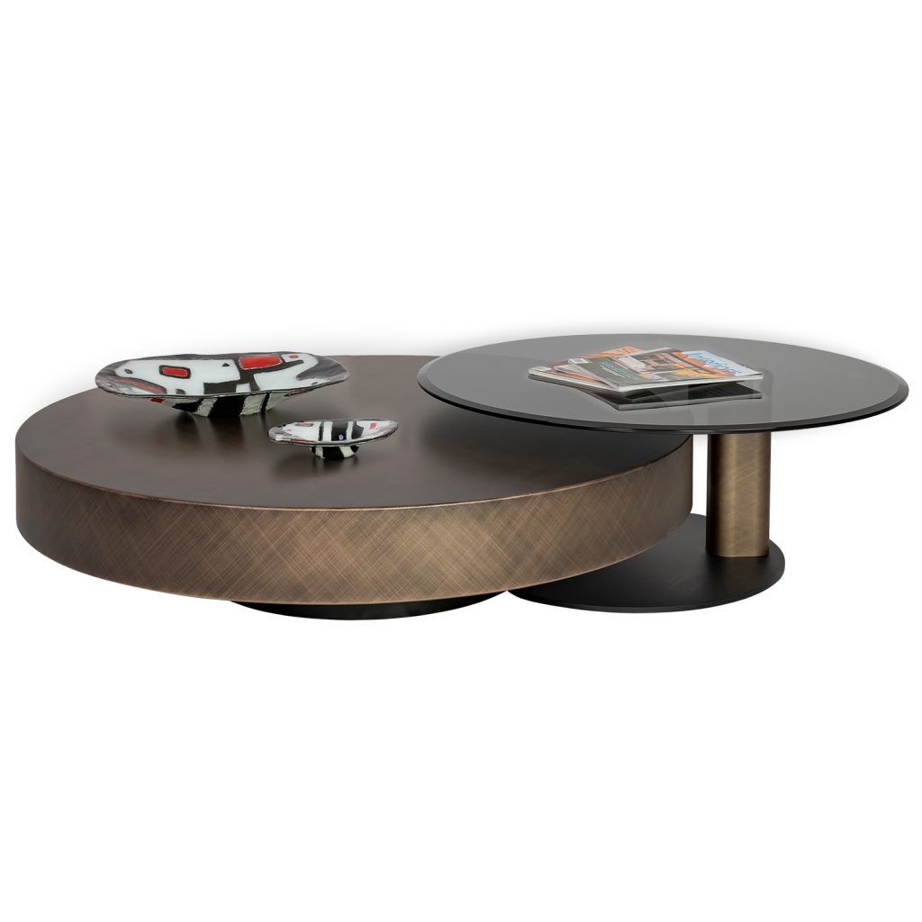 [0] => arena bond coffee table with black gfm73 base, brushed bronze top and column and beveled fume glass swivel. design by yasuhro shito.
