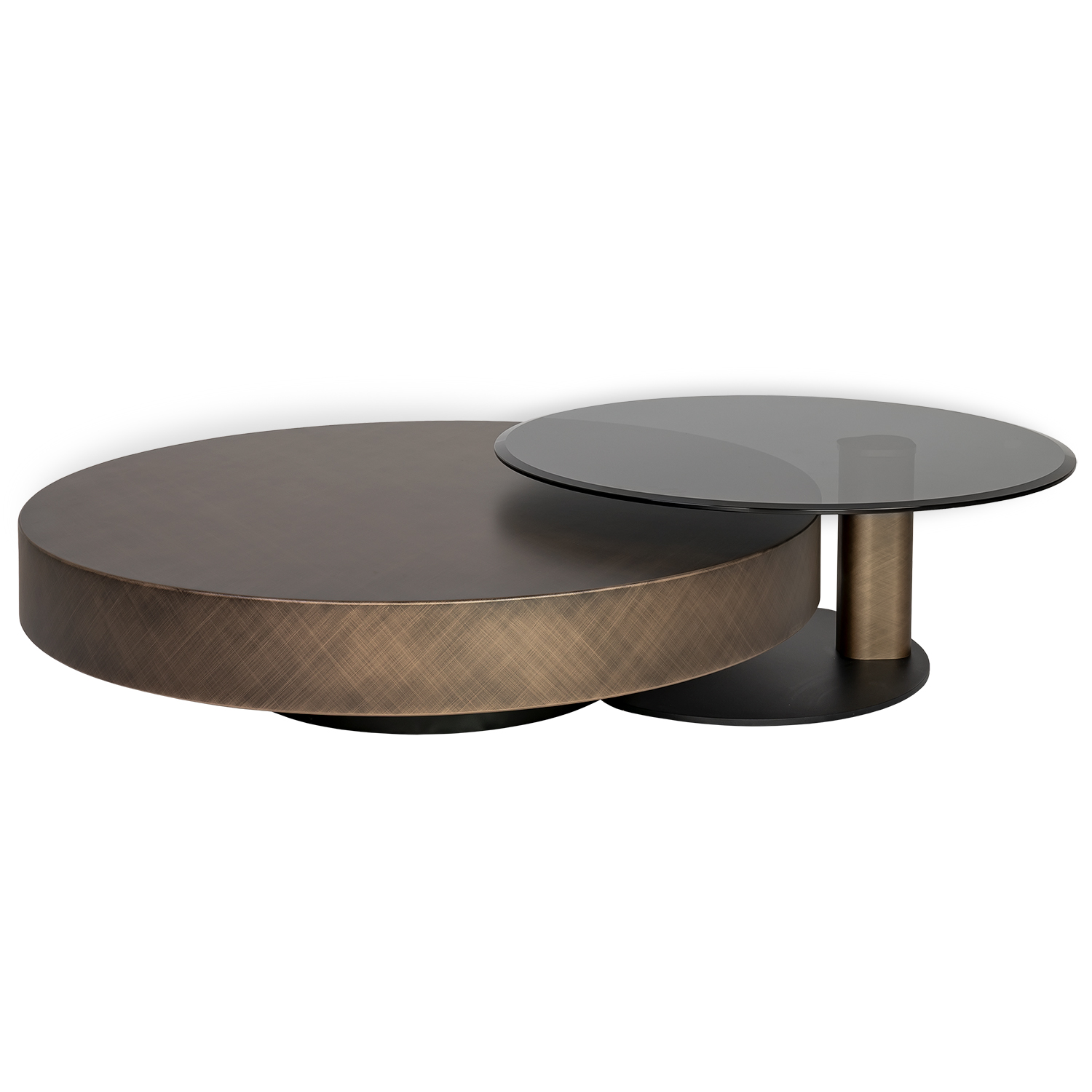 Add a statement piece to your living space with the Arena Bond Coffee Table by Cattelan Italia. Made in Italy, Arena is a tour de force, with a brushed bronze table flanked by a smaller revolving top in fumé glass. The overlapping structure of this coffee table is softened by complementary elements, with the brushed bronze column of the side table matching the larger tabletop, as well as both featuring coordinating black-embossed steel bases. Arena is eye-catching and spacious, creating the perfect centerpiece for any type of social occasion.