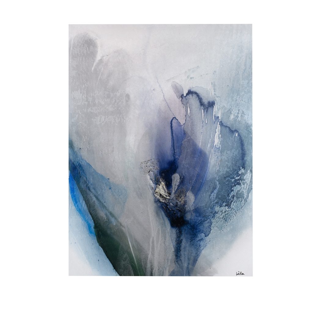 The Aria Wall Art features cool tones of blue, grey, and purple that flow together, imitating the natural movement of air. The darkness at the center dissipates in all directions, inspiring a feeling of lasting tranquility.