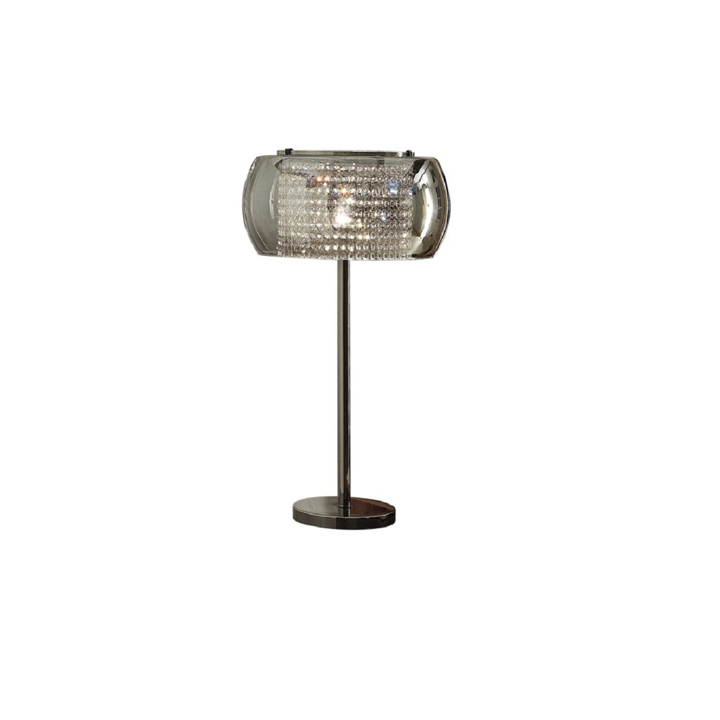 [0] => The Aristo Table Lamp has a glamorous feel, with a matte black nickel base and stem, a grey glass shade, and a curtain of clear crystals that reflect the light. The sleek design will complement any contemporary space and add a stylish flair. The Aristo Table Lamp has an on/off cord switch and takes a 60W E26 or E27 lightbulb, not included.