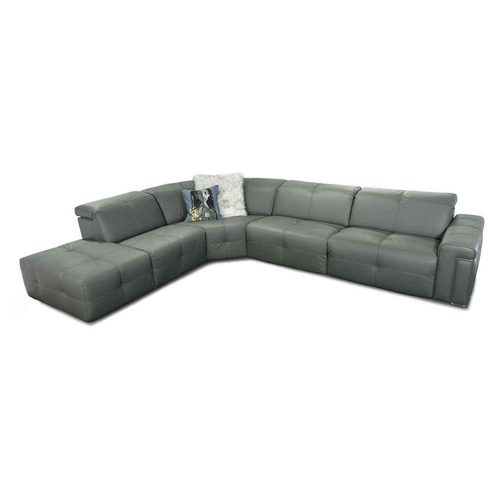 The Arline Sectional, made in Italy, features slate grey bull leather, chrome metal accents, two power reclining seats, and one seat with a manual headrest. Wide, square tufting and the amply padded seat and back give this sectional a contemporary look and a comfortable feel, while the two power seats allow you to adjust the seat back and footrest to your preferred angle. With clean lines and plenty of seating space, Arline is the perfect place for relaxing and entertaining.