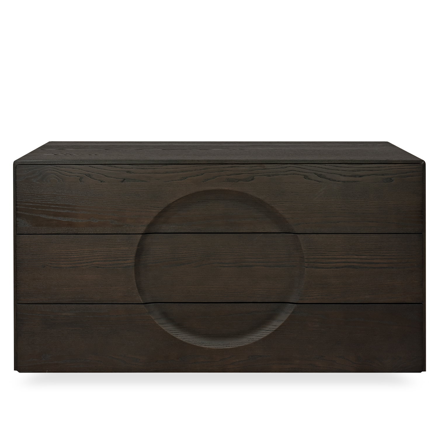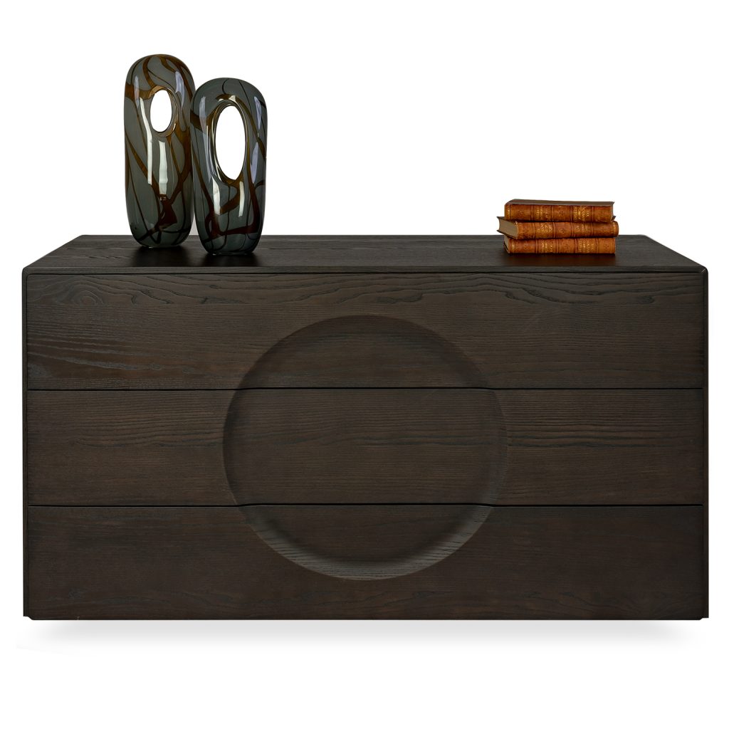 Made in Italy, the Armadi Three-Drawer Chest combines a clean look with a one-of-a-kind accent. Armadi is crafted of ash wood with a dark brown caffe finish, and has a circular impression carved smoothly across its three front drawers in a continuous shape. The extra-wide push-to-open drawers offer plenty of space to store clothes and bedding, while discreet legs provide support. Rounded top corners form a visual complement to the circular shape below.