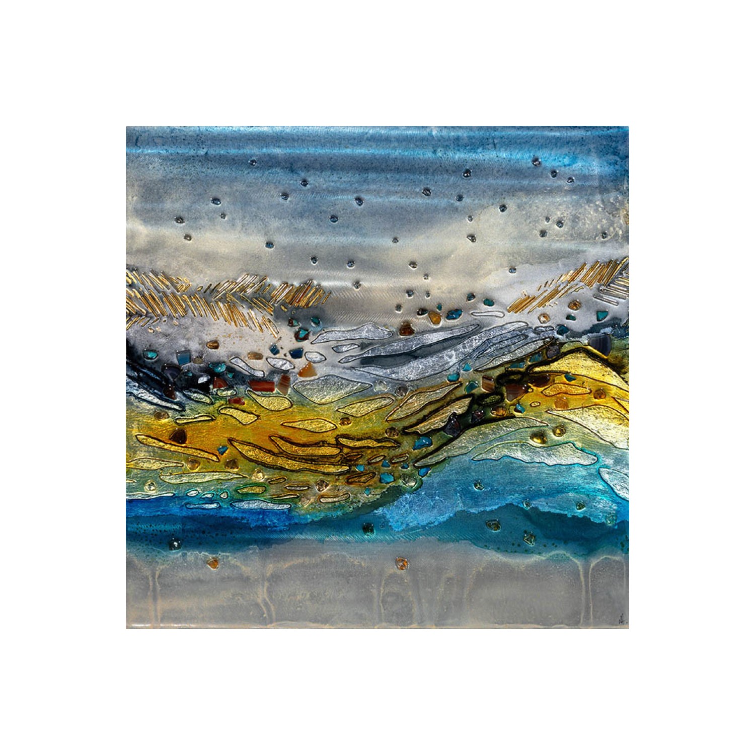 The Arroyo Drift II Wall Art showcases the beautiful flow of life and water in a ravine. Warm bursts of gold and brown draw the eye toward the center of the piece, while a cool border, formed by textured blue and grey tones, grounds this artwork. With a gallery wrap canvas and semi-abstract form, this wall art evokes appreciation of nature.