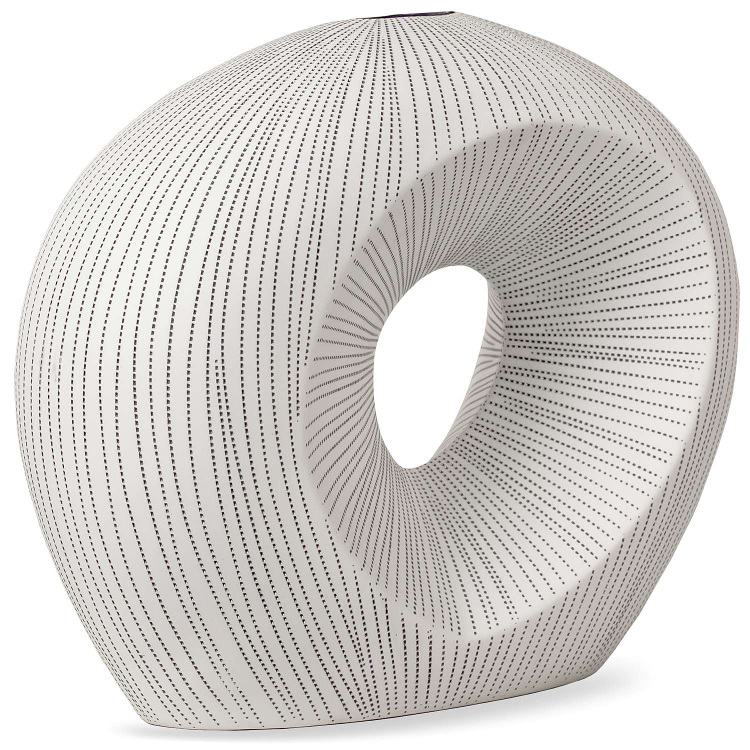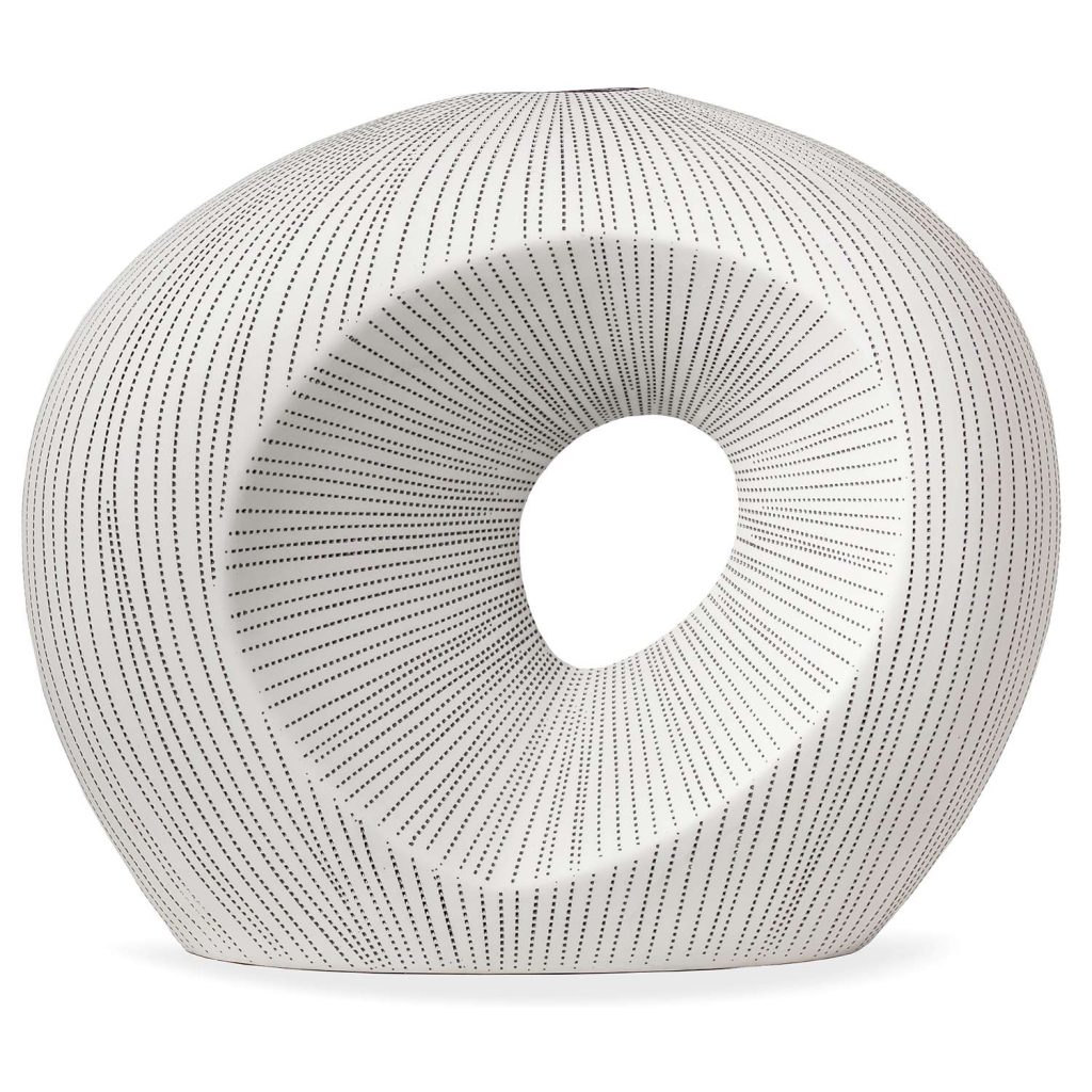 The Artura Large Vase is handcrafted from off-white porcelain with a delicate pattern of thin grey dotted stripes. Evoking both modern art and natural forms, Artura features a round, organic shape with a concavity surrounding the hole in its center. Show off a tasteful bouquet in this watertight vase or display it with other Artura vases to bring one-of-a-kind accent to any room.