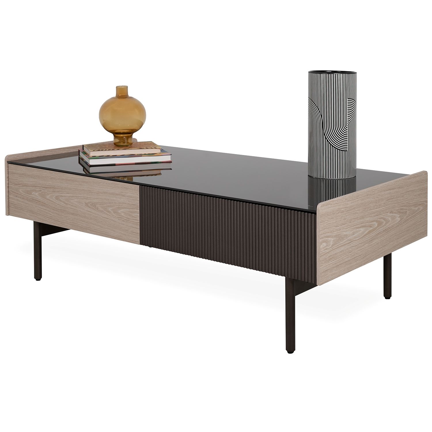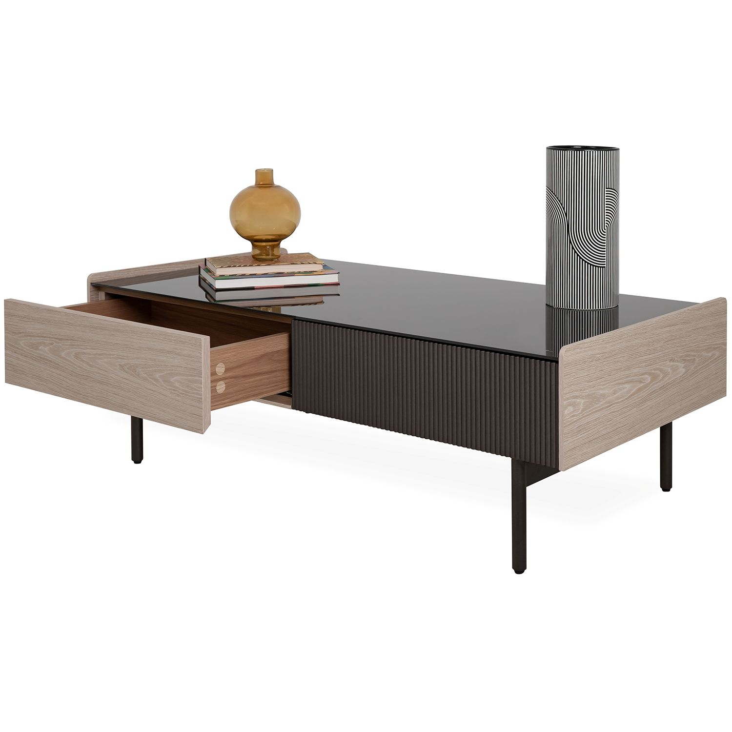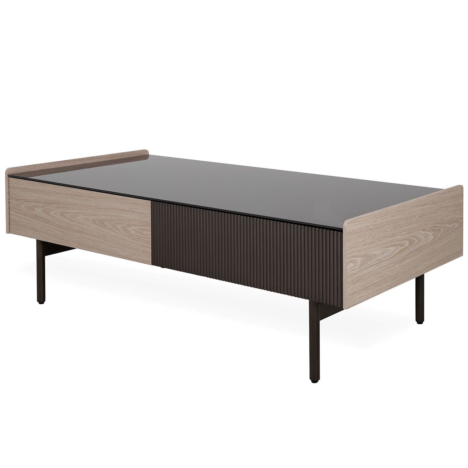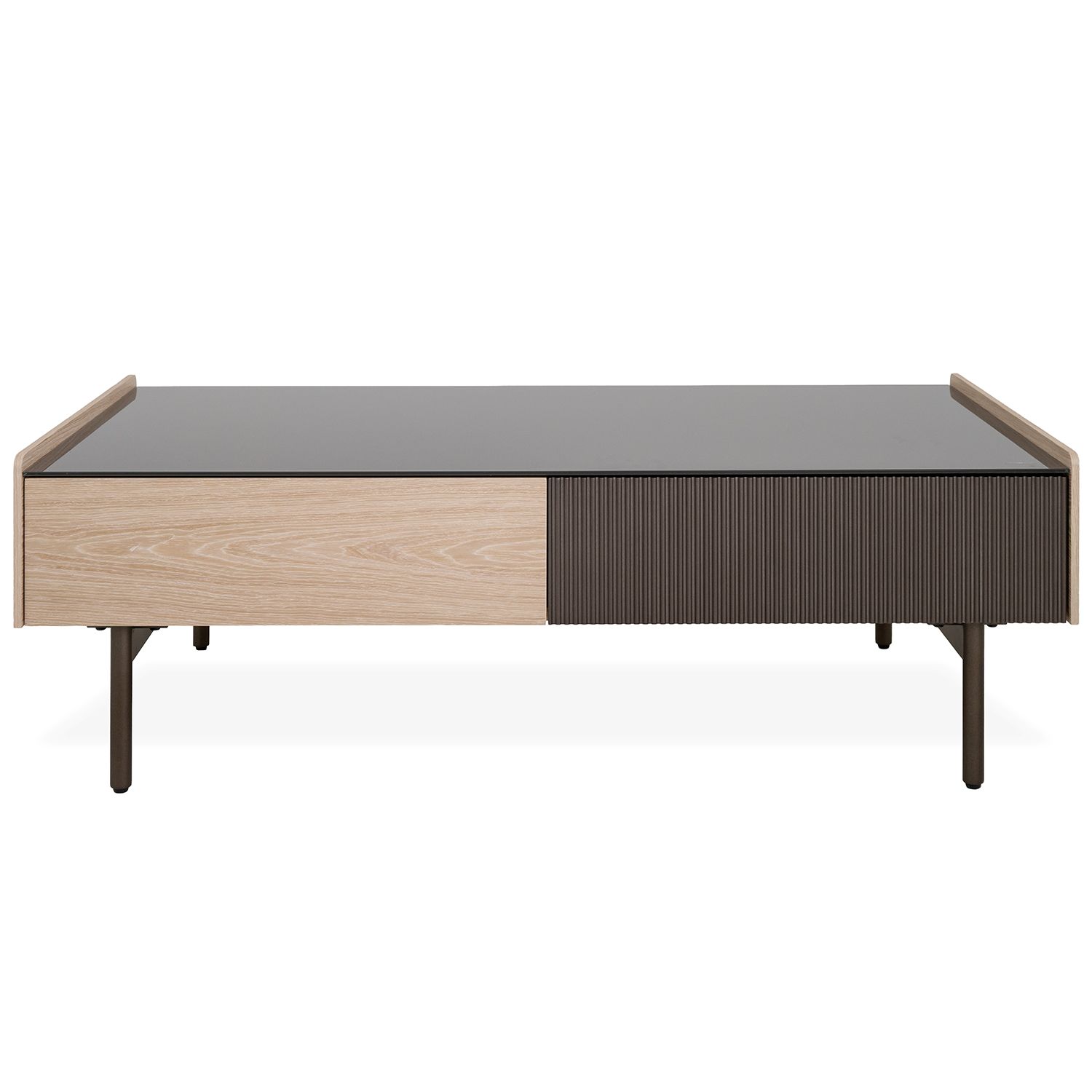 The Ashby Coffee Table combines contrasting materials and textures to achieve a stylish blend of sleekness and warmth. Ashby's light oak veneered wood structure supports a brown glass tabletop, with two soft-close drawers below to aid in living room organization. The right-side drawer features a brown lacquered front whose textured vertical ridges form a pleasing contrast to the horizontal grain of the wood. Slim legs in brown metal and slightly raised edges on the short sides of the tabletop further contribute to Ashby's simple yet striking silhouette.