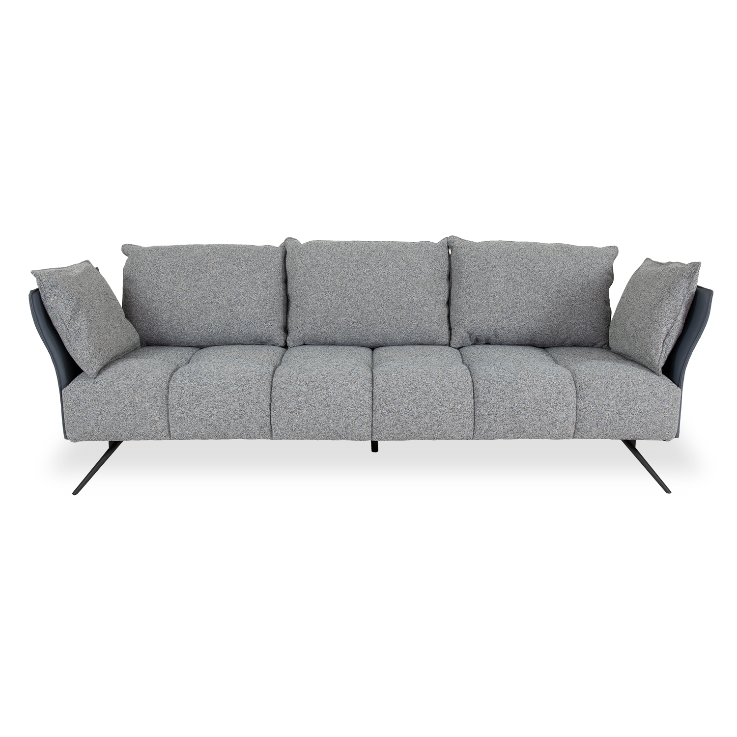 The Asti Sofa is made in Italy and has a chic, contemporary look, with squared tufting on the seat, plush back pillows, and sharply angled matte black legs. Asti is fully upholstered in woven grey Caleido fabric and has curved side arms and back supports in grey Luna leather that complement the soft, rounded lines of the seat and pillows. Asti has a cozy, comfortable feel that invites you to sink in and relax.