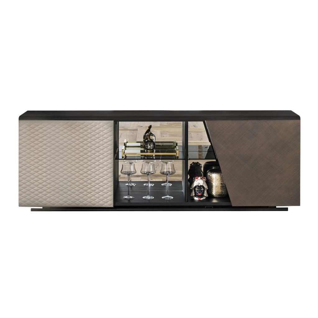 [0] => The Aston Sideboard, made in Italy, has a striking design that highlights the fashionable aspects of modern furniture. Glass shelves and a mirror complement the black frame, while the sideboard's geometric look is enhanced by its single door in brushed bronze, and the other in soft fango leather with a quilted design. This combination of textures will make this piece the focal point of any room.