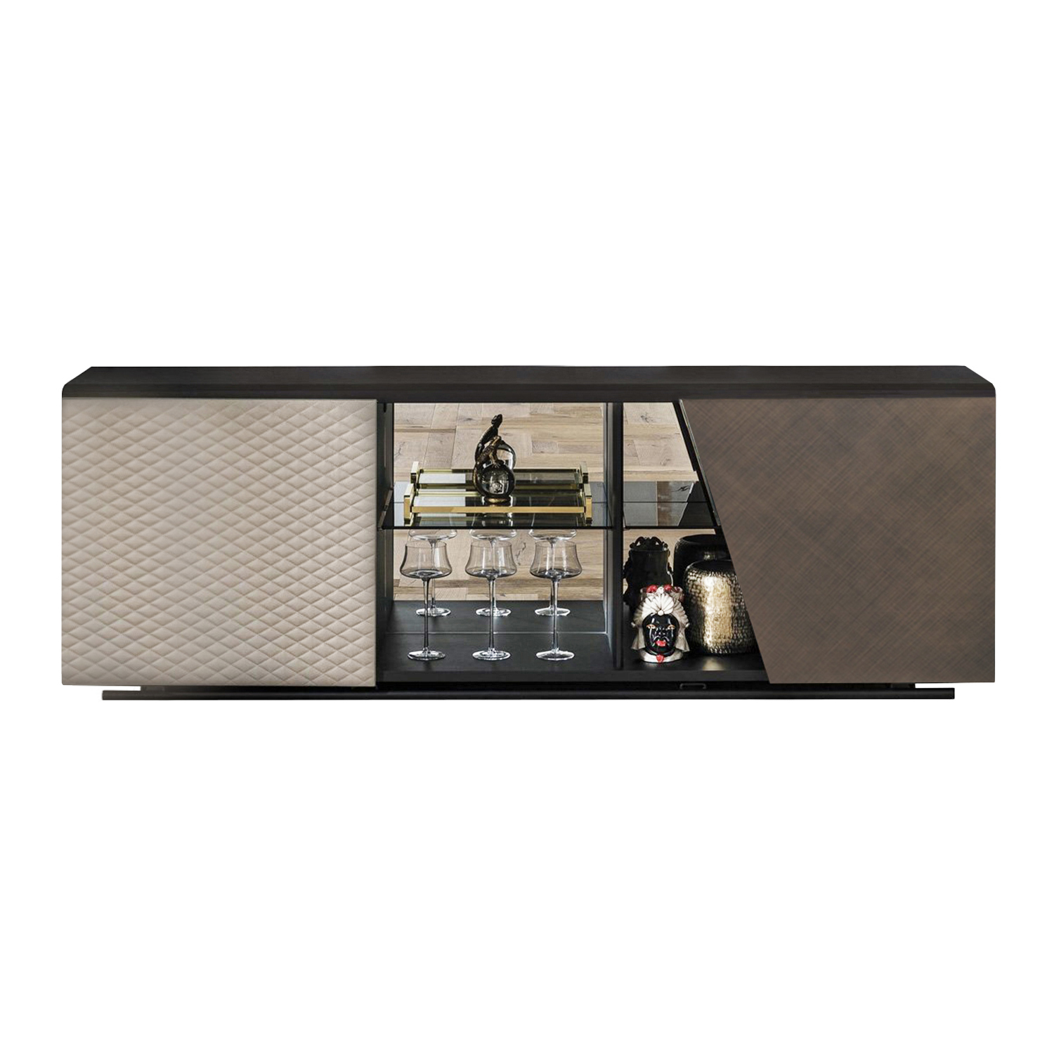 The Aston Sideboard, made in Italy, has a striking design that highlights the fashionable aspects of modern furniture. Glass shelves and a mirror complement the black frame, while the sideboard's geometric look is enhanced by its single door in brushed bronze, and the other in soft fango leather with a quilted design. This combination of textures will make this piece the focal point of any room.