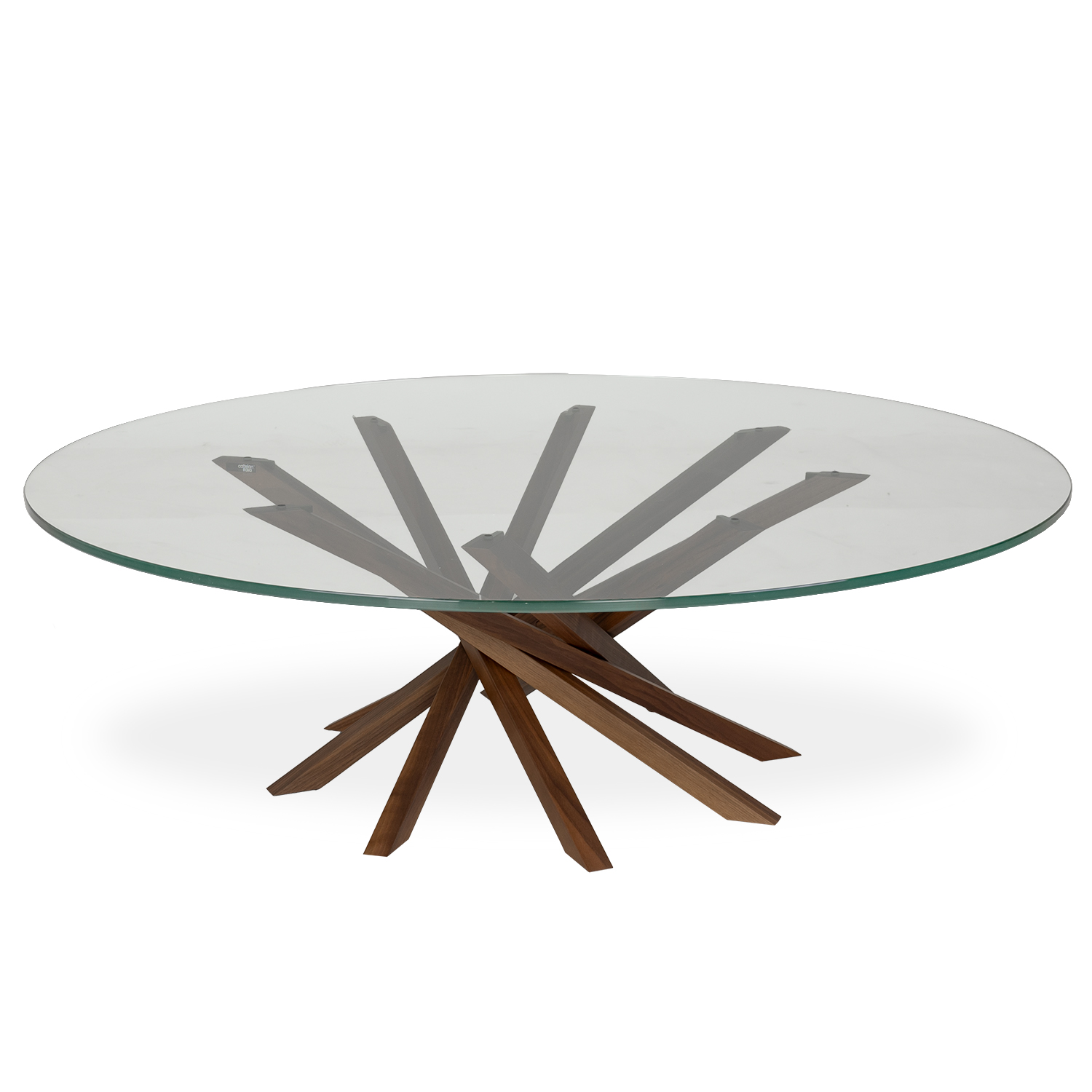 [0] => atari coffee table 120cm diameter with clear glass top, base in natural caneletto walnut base. 47.25" diameter x 15" high.