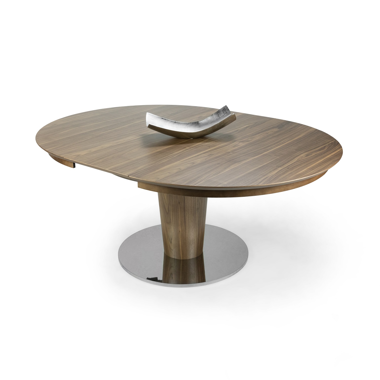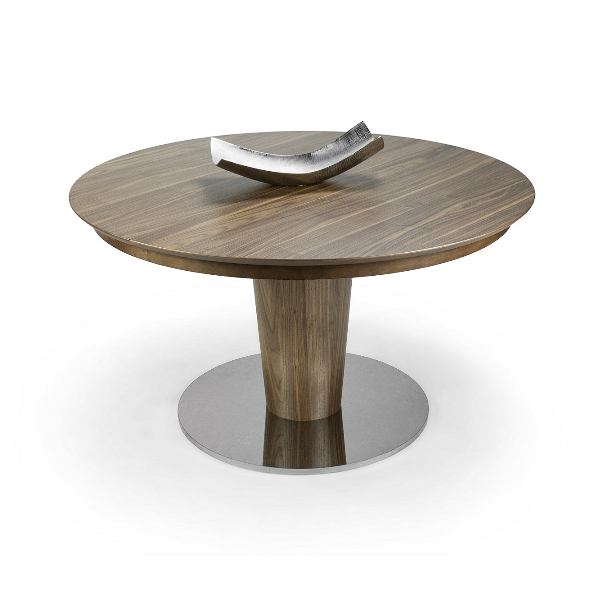The Atlanta pedestal dining table features rich walnut wood tones and striking, smooth lines. The tabletop tapers beautifully into a mirrored metal base that reinforces the concentric feel of the design. Atlanta has a self-storing extension that unfolds to extend the table from 53'' - 71" in diameter.