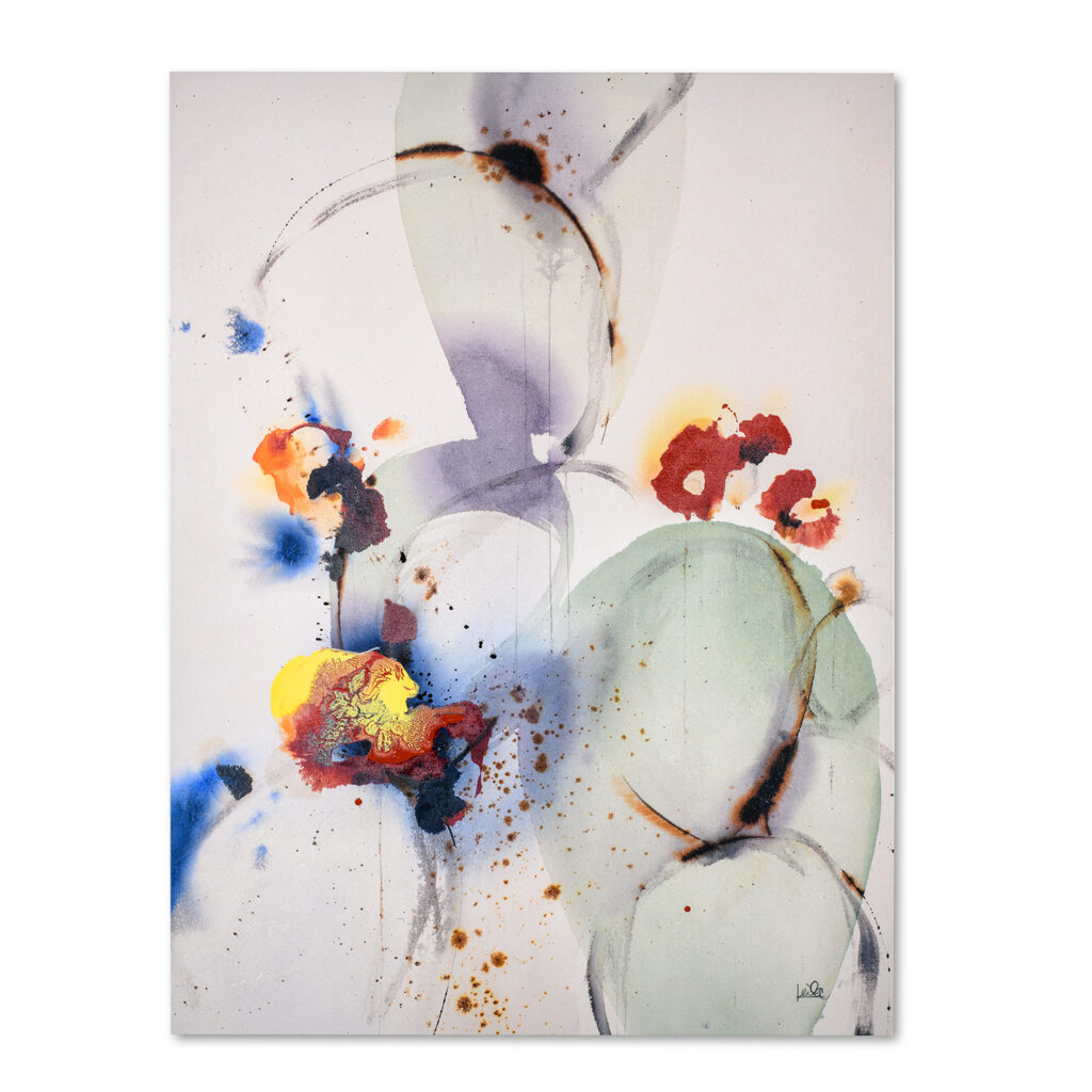 The Aurora De Flores Wall Art is a tranquil piece with pastel shades of purple and green highlighted by bold primary tones of blue, yellow, and red. Subtle floral shapes emerge from one another, while the subtle lavender background adds a layer of peace.