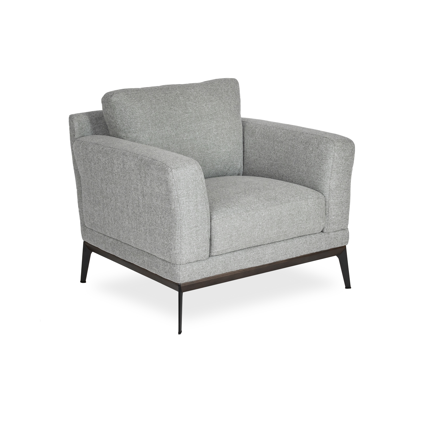 The Austin Chair has a clean, contemporary look, with a wide seat, curved armrests, and Feliz fabric upholstery in ash grey. The wood trim adds a warm contrast to the cool tones of the fabric and angled black legs, and the flared armrests offset the straight lines of the base and back. Austin's understated design and neutral tones can fit into a wide variety of design environments.