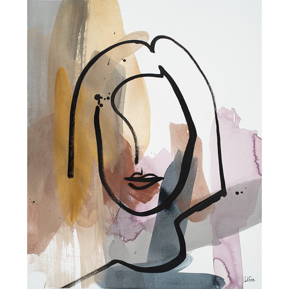 The Autonomy III painting is contemporary and lighthearted, with a colorful abstract background and a minimalist silhouette of a woman. The bold black lines of the figure contrast against the soft purple, red, yellow, brown, and grey brushstrokes. Autonomy III will add a subtle color accent to any living or office space.