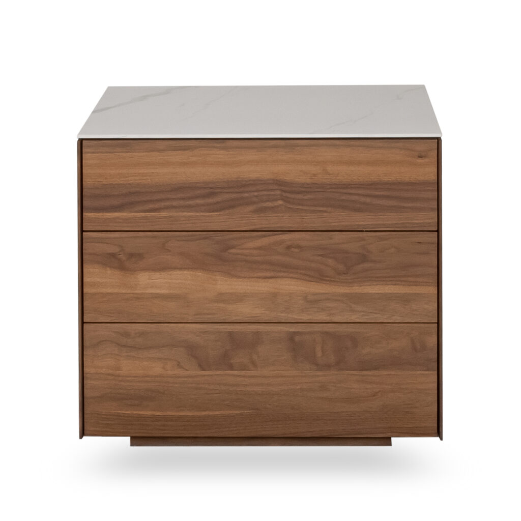 The Avita Night Table features a classic smoked walnut finish with an elegant, contrasting white porcelain top. Avita's three drawers open with a simple push to allow you to keep reading materials, valuables, and other bedroom accessories close at hand. With a minimalist and streamlined design, Avita will harmonize with virtually any design aesthetic.