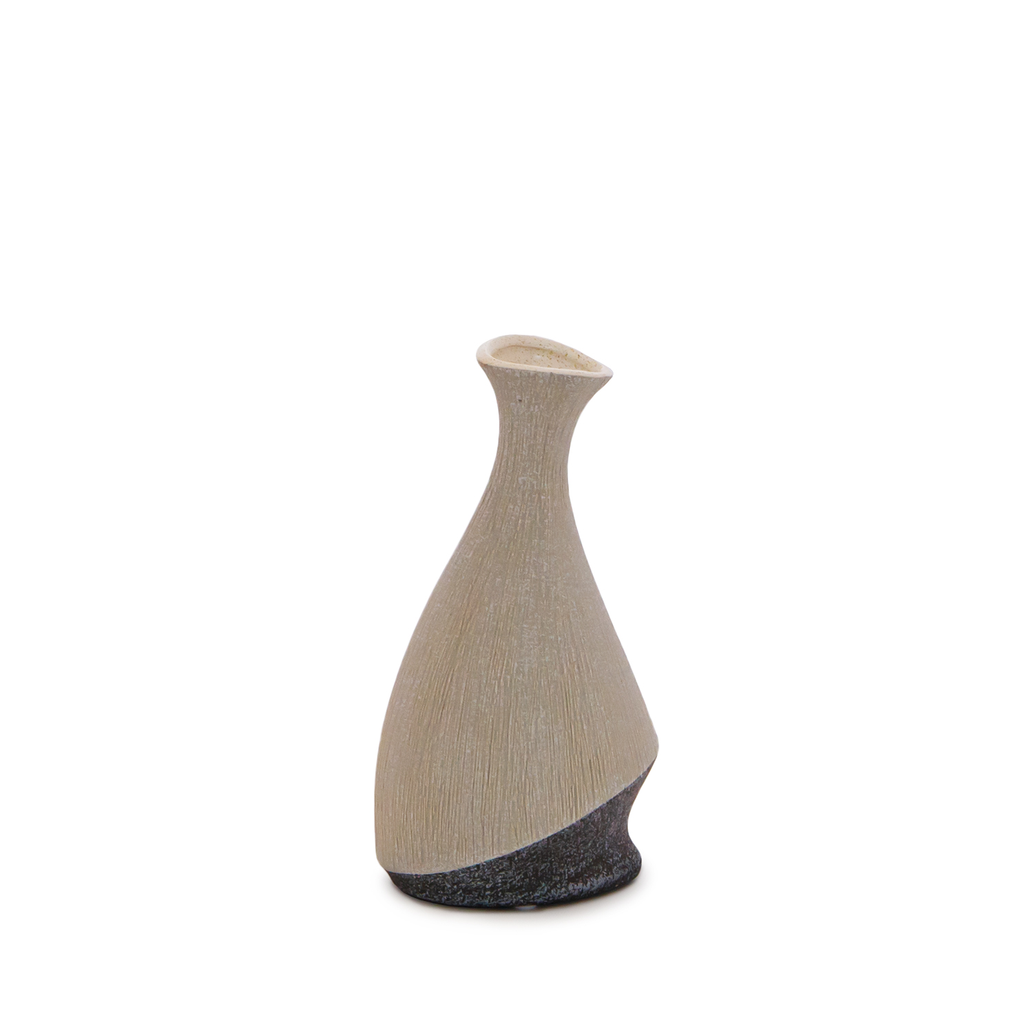 The Balance Two Toned Small Vase features an asymmetrical, curved silhouette with a flared top and concave base. The matte light grey body is textured with narrow brush strokes, contrasting against the black and grey base and the glossy white interior flecked with brown. Balance can stand on its own as an art piece or display flowers and other greenery.