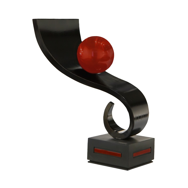 [0] => The Balancing table sculpture, crafted from tinted and polished stainless steel with painted cold-rolled steel, creates the illusion of frozen motion as the bright red ball balances in space.