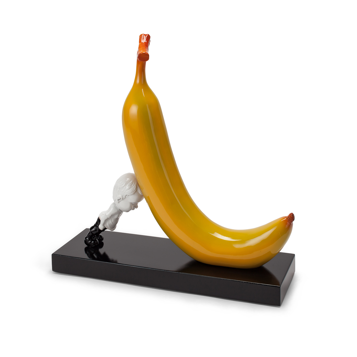 Banana & the Boy is the perfect table dcor to add a quirky charm to your living or office space. A black wood base holds up a young boy leaning against a bright yellow banana. Subtle red and green accents add shine and texture to this piece.