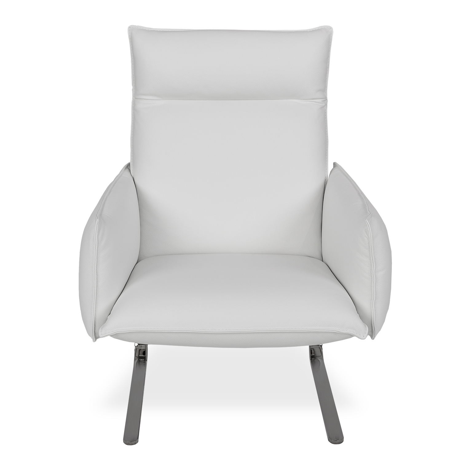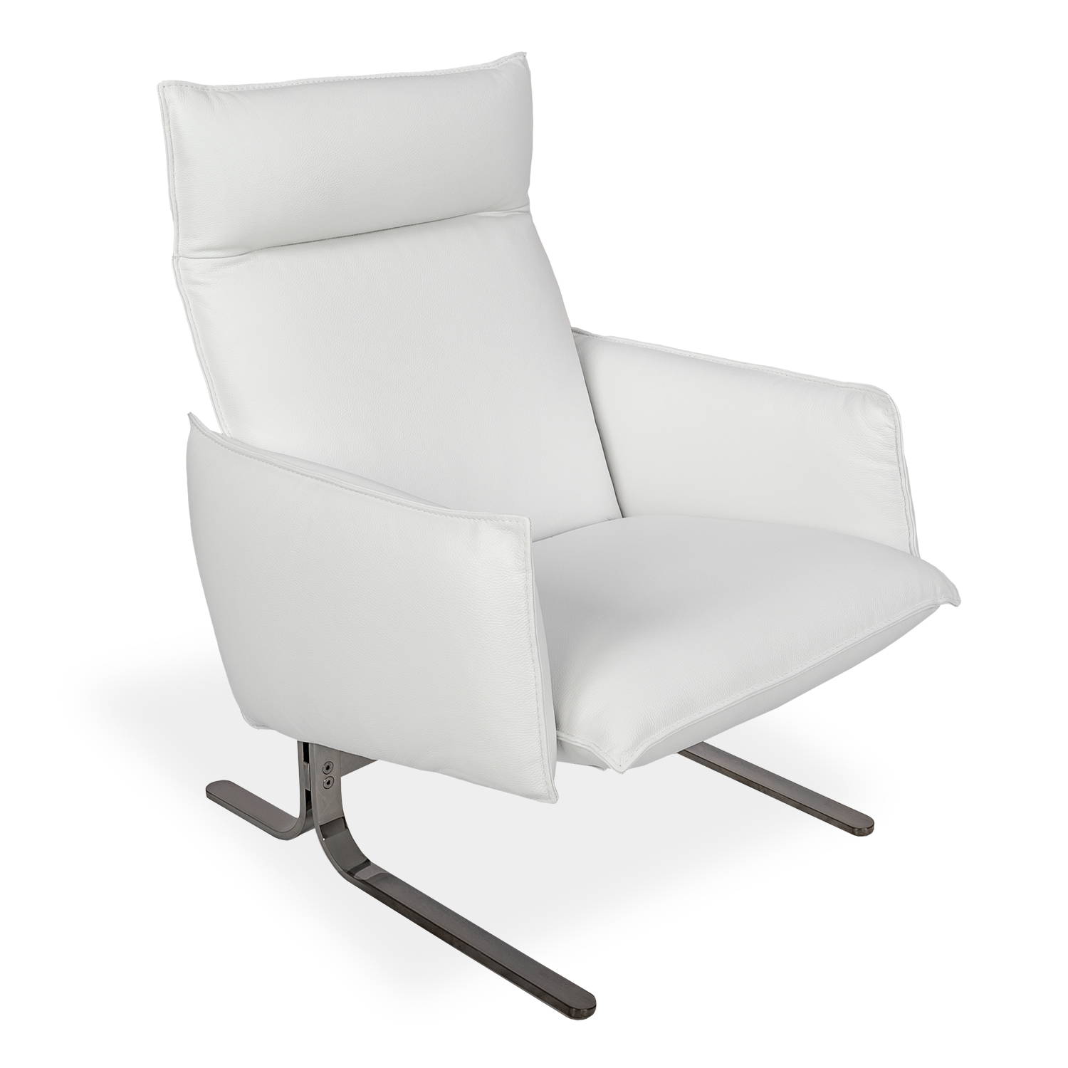 The Barry Armchair combines a plush, inviting look with an unabashedly contemporary profile. Upholstered in pure white Brando leather, Barry features a pillowy-soft seat and arms with a backrest set at an angle to encourage lounging. A manually adjustable headrest lets you find just the right amount of neck support, while inverted seams on the upholstery add a touch of style. Black nickel legs provide support while featuring a slim shape and shiny finish that contrasts with the matte leather and full-bodied cushioning of the seat.