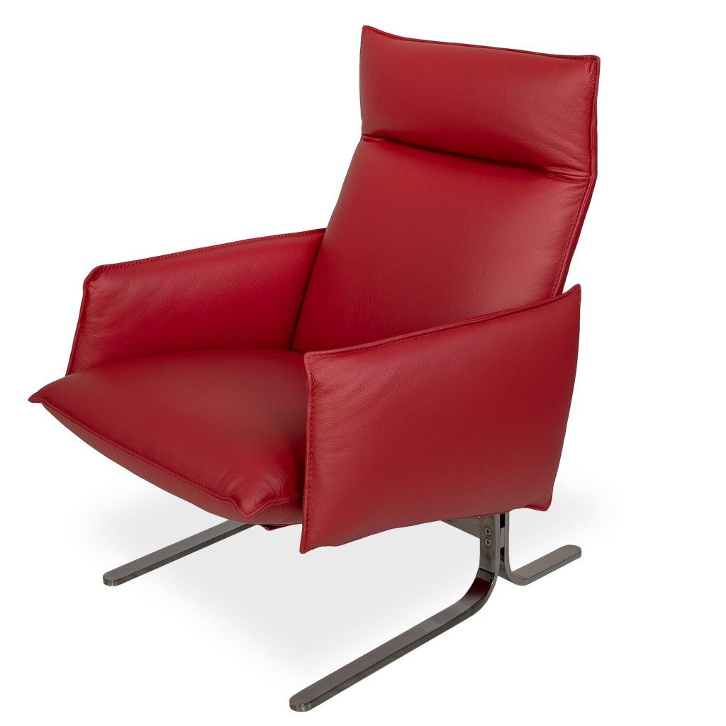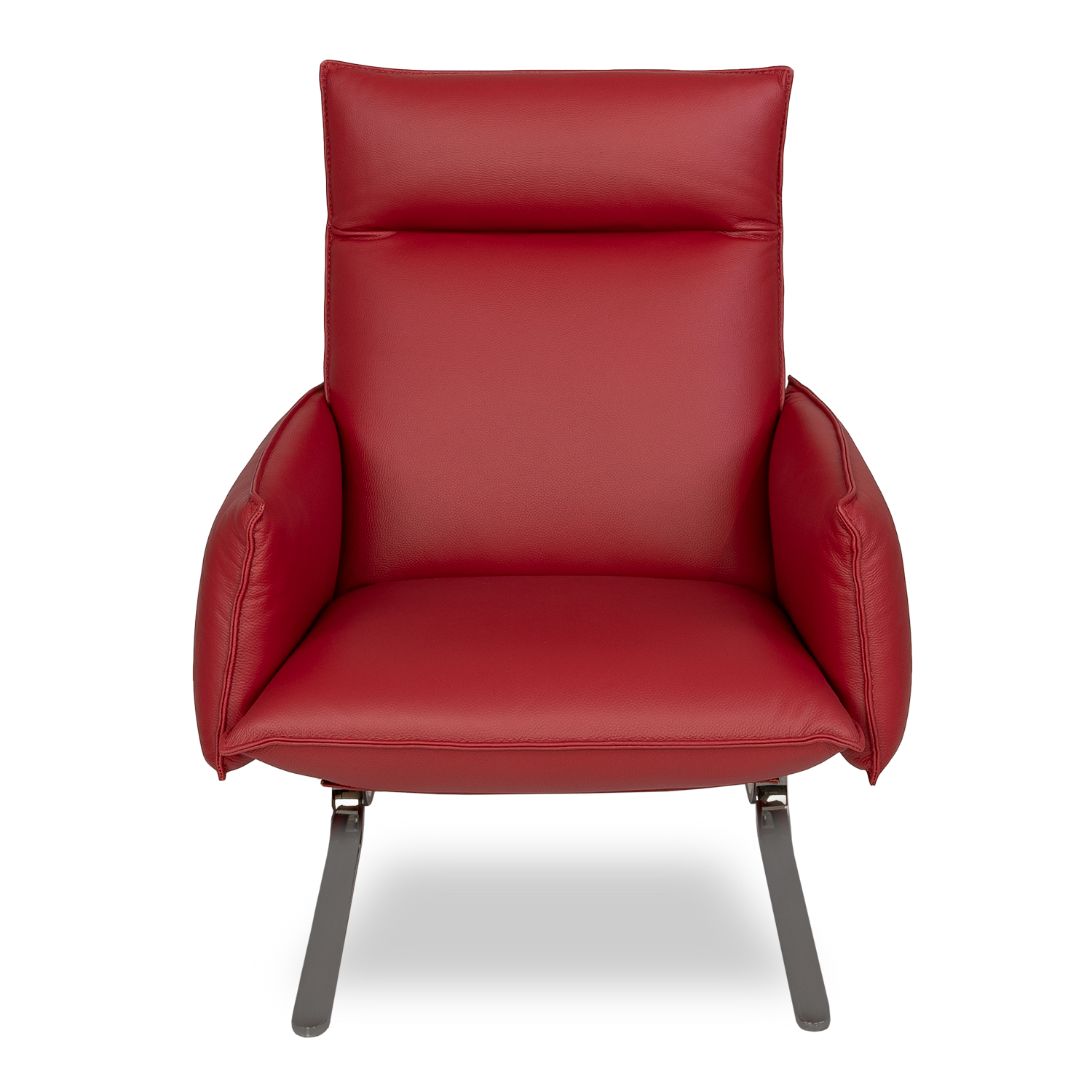 The Barry Armchair combines a plush, inviting look with an unabashedly contemporary profile. Upholstered in dramatic red Brando leather, Barry features a pillowy-soft seat and arms with a backrest set at an angle to encourage lounging. A manually adjustable headrest lets you find just the right amount of neck support, while inverted seams on the upholstery add a touch of style. Black nickel legs provide support while featuring a slim shape and shiny finish that contrasts with the matte leather and full-bodied cushioning of the seat.
