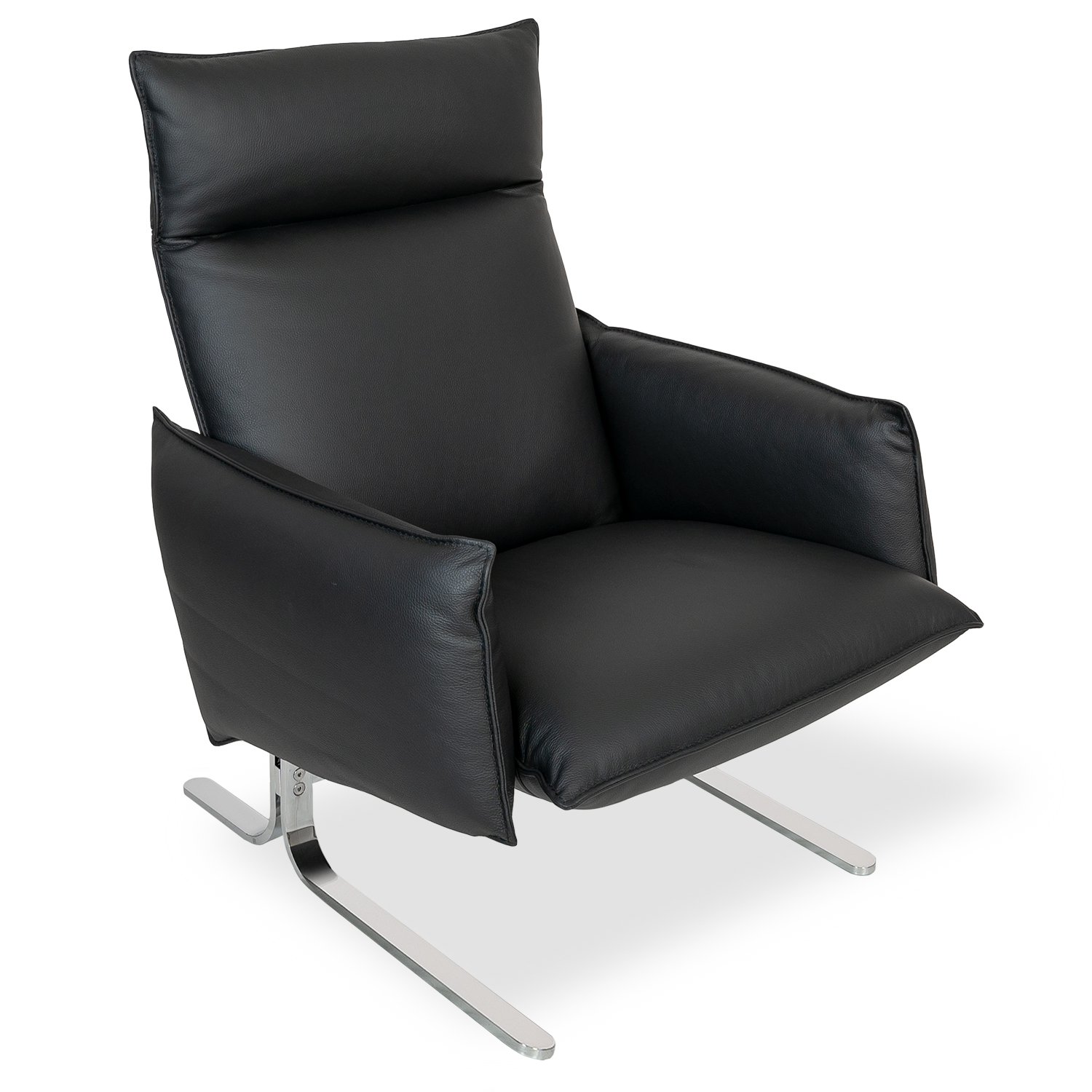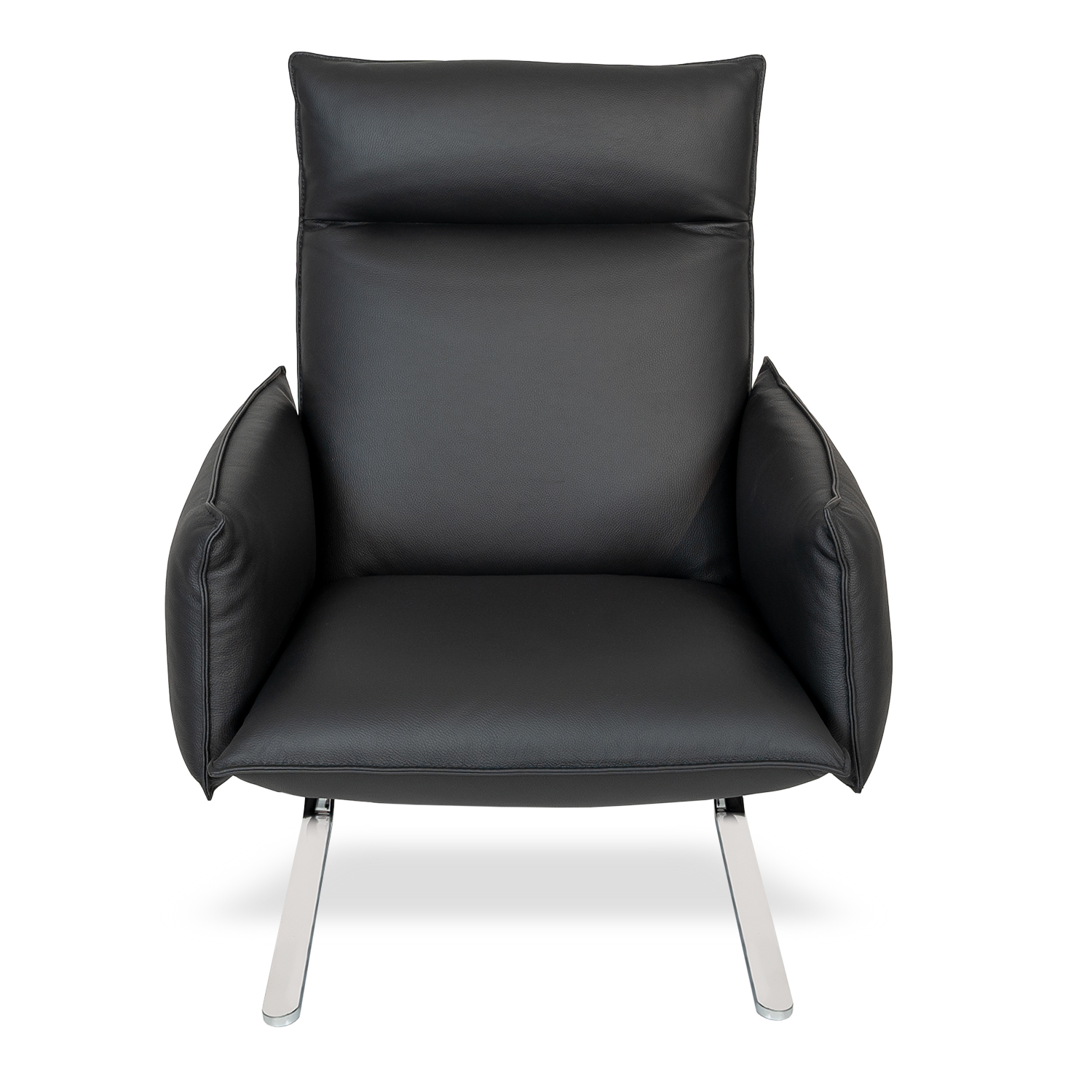 The Barry Armchair combines a plush, inviting look with an unabashedly contemporary profile. Upholstered in black Brando leather, Barry features a pillowy-soft seat and arms with a backrest set at an angle to encourage lounging. A manually adjustable headrest lets you find just the right amount of neck support, while inverted seams on the upholstery add a touch of style. Chrome legs provide support while featuring a slim shape and shiny finish that contrasts with the matte leather and full-bodied cushioning of the seat.