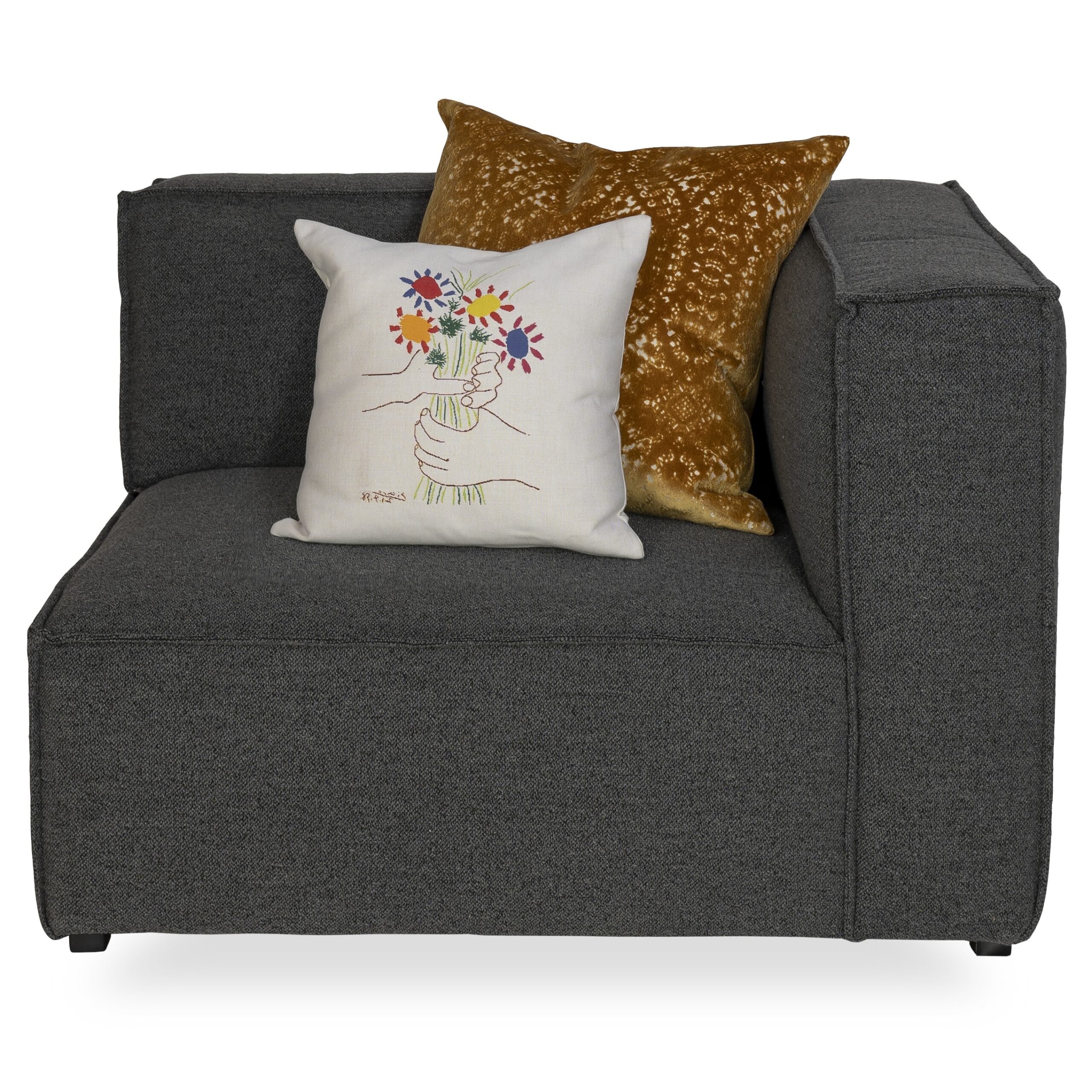 The Beacon Right Corner Chair features a structured, geometric look with tailored lines and deep grey Crush fabric upholstery. With a wide, cushioned seat, and broad arms, Beacon makes a distinct yet versatile design statement, further heightened by welt stitching and a subtle corded texture. Use the Beacon chair on its own or mix and match with other pieces in the Beacon collection to form a customized, modular sofa or sectional.