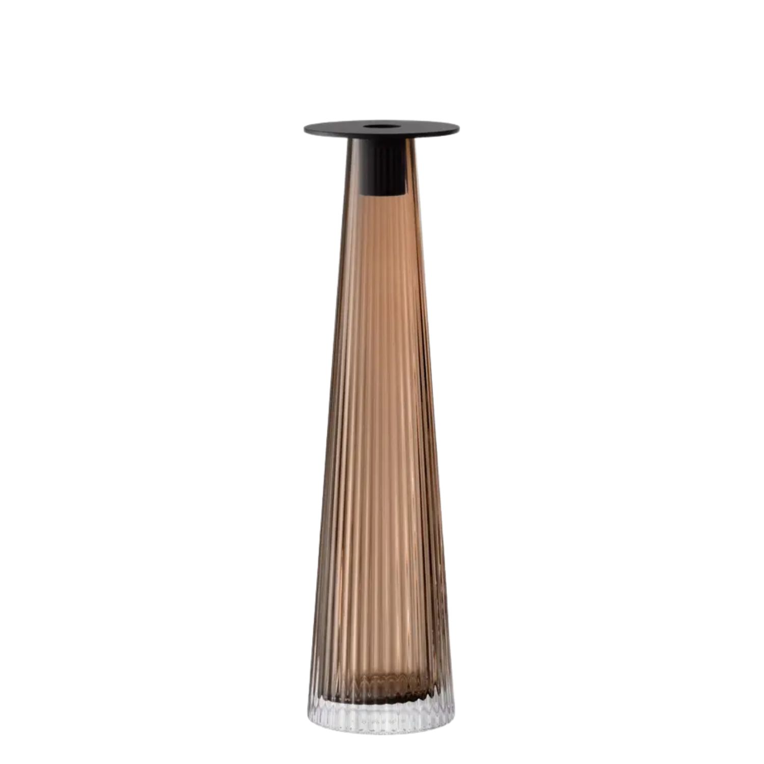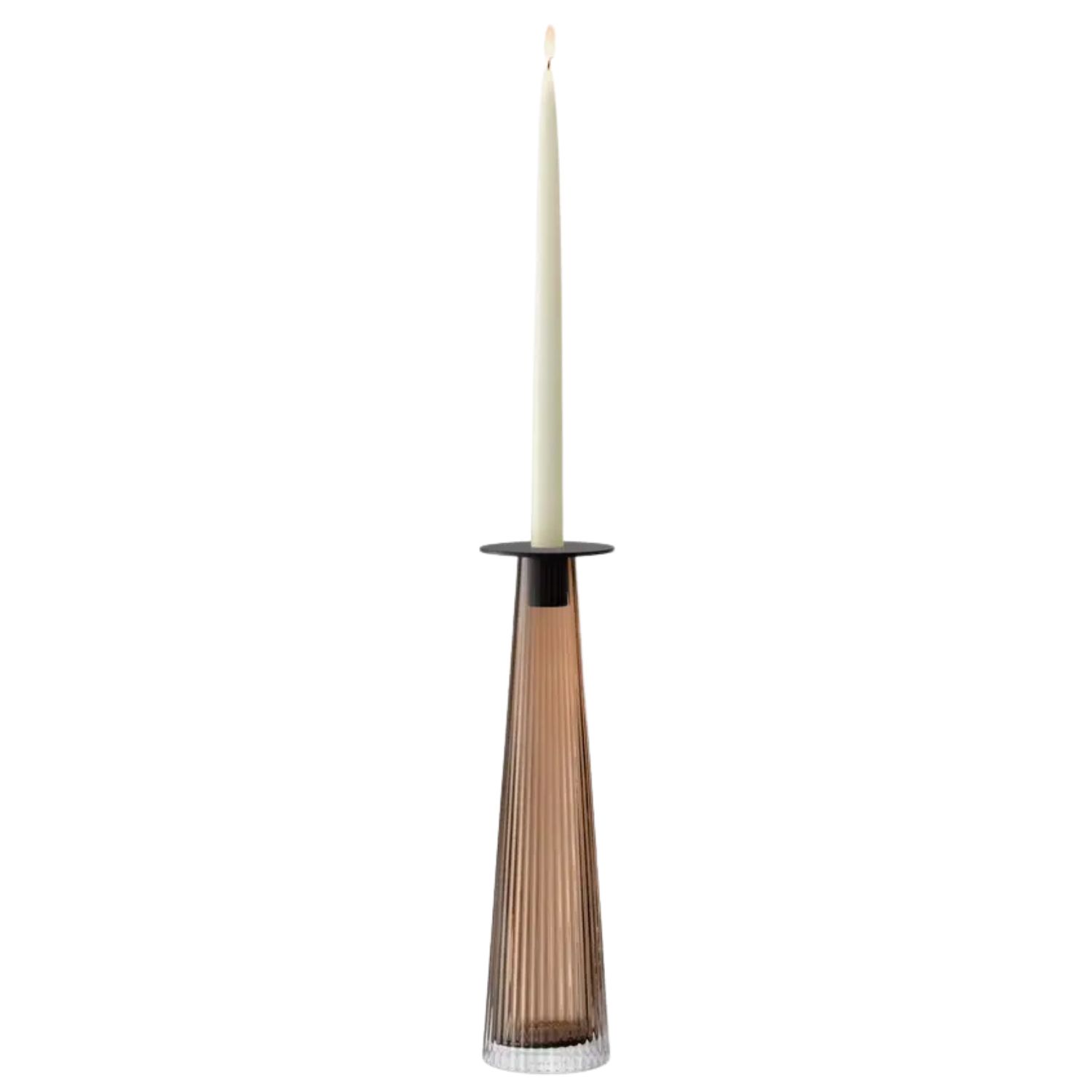 The Beacon Tall Candleholder Vase brings clean and functional style to your table with its modular, multipurpose design. Beacon features a mouth-blown glass body in taupe with a conical form and pleated texture. A powder-coated steel insert in contrasting black can hold a taper candle or be removed to let the glass base function as a vase. Group with other items in the Beacon collection to bring layered warmth to your modern living or dining area.