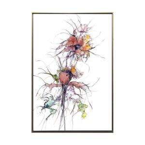 Beaded Arrow, by L. Tuza, is an abstract wall art depicting a stream of earthy colors curving and reaching out tendril-like lines over a white background. Shades of olive green, mustard yellow, rust brown, and burgundy mingle in a free-flowing manner, and a black frame makes this artwork ready to display.